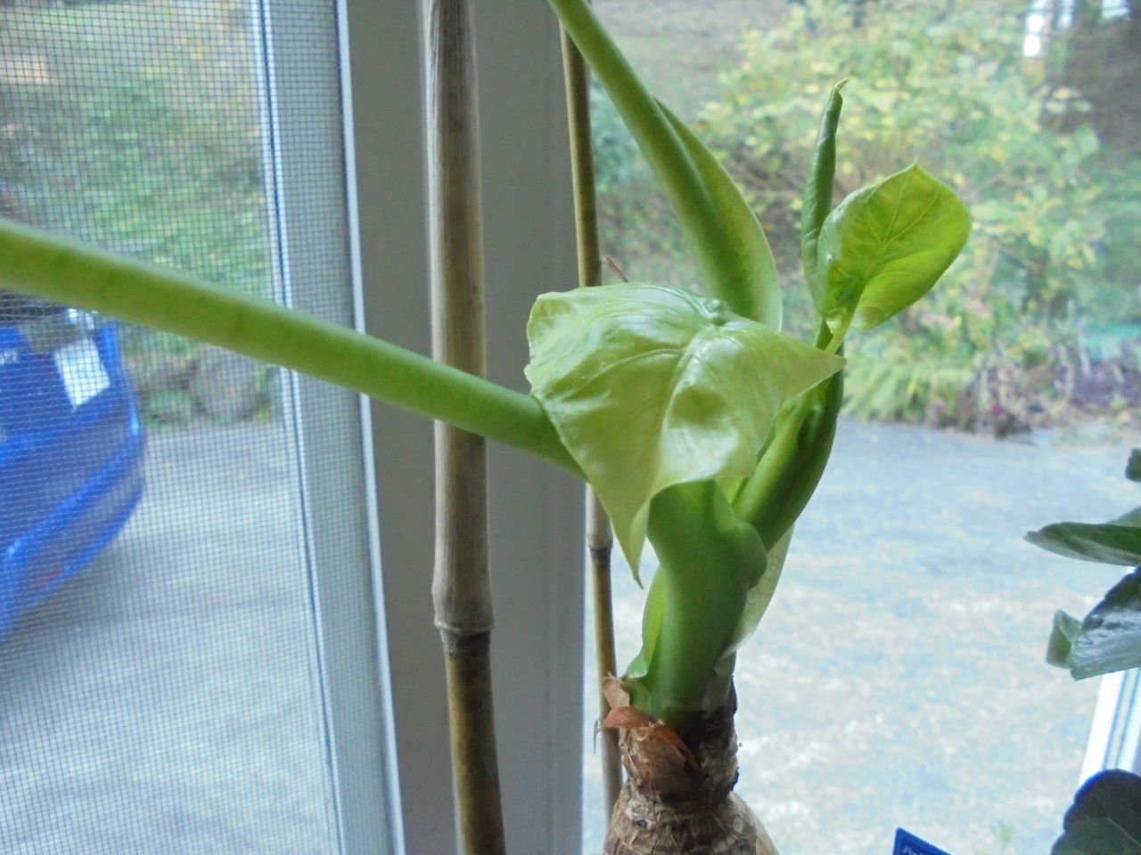 集中治療室に入っていたクワズイモはその後、持ち前の生命力を発揮し、新しい芽をどんどん出している。園芸やさんで買った後に植木鉢を倒して根元からポッキリ折れた茎がわずか皮一枚で繋がっていたにもかかわらず元気を取り戻し、葉の縁が黄色味がかっているが未だに元気な姿を見せている。写真をアップして見ると葉の表面に土の粒子が沢山ついている。鉢を倒した時、鉢の土が葉についたもので水で洗ってあげれば良かったが、瀕死の重傷だったのでそんな荒治療が出来なかった。