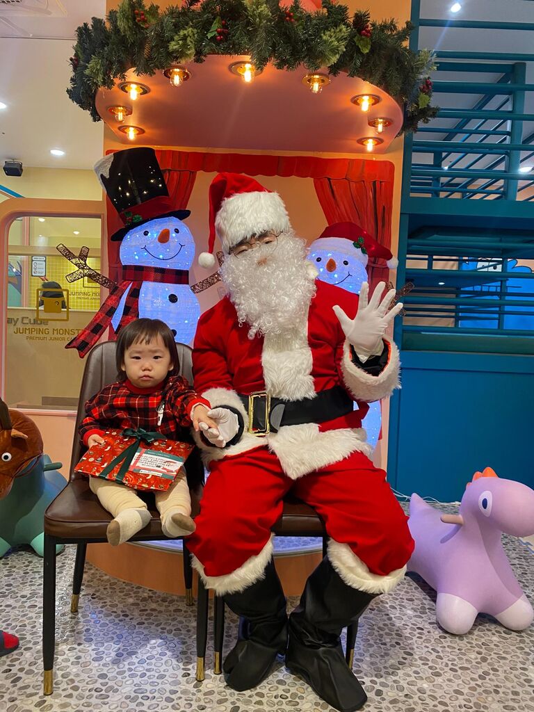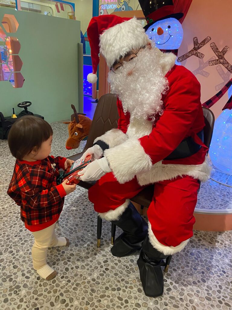 下段左はサンタさんからプレゼントをもらうお孫さん。真ん中はサンタさんの横に並んでの記念写真。しかし、お孫さんはちょっと緊張気味。そして右、サンタさんの横に座っていて怖くなったらしく、泣き出してしまう。当日は父兄も参加したイベントだったので親友の息子さんと奥様も参加し、写真撮影をした。
