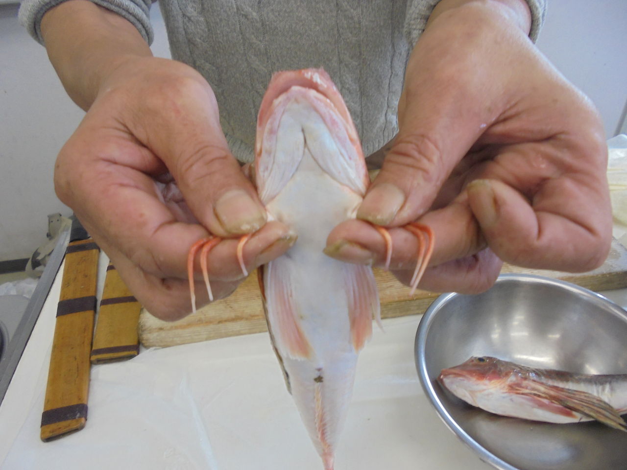 ほうぼうは横幅が広い。三枚におろす時、お魚を横にするが普通の魚と違って、包丁を入れる時に倒れないようにしなければならないため、まな板の上でコツがいる。