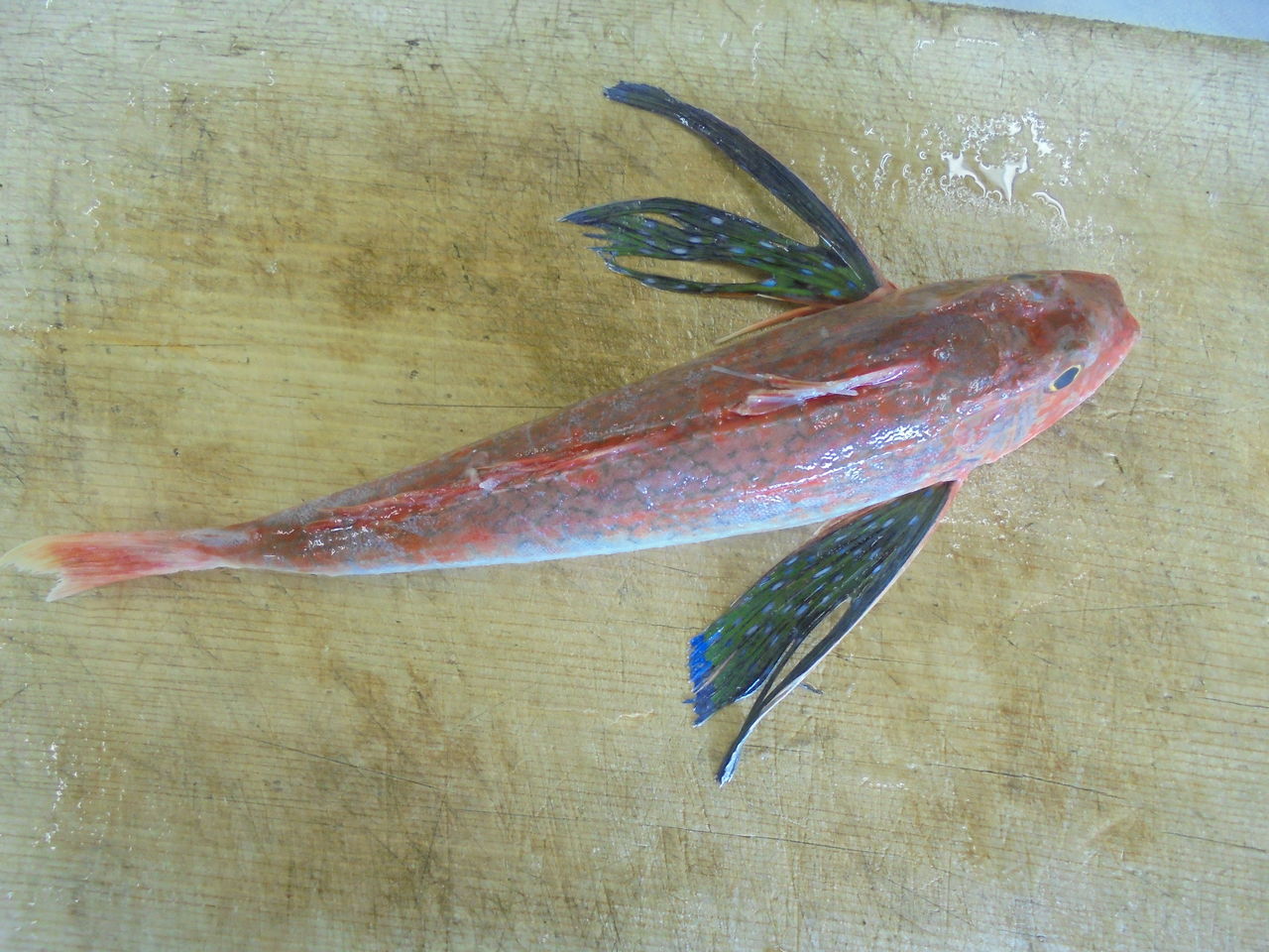 ほうぼうはピンク色で実に綺麗なお魚だ。何といっても両脇についているヒレが独特だ。普段は畳まれていてお魚に同化されているが、拡げると綺麗なキラキラしたブルーになる。
