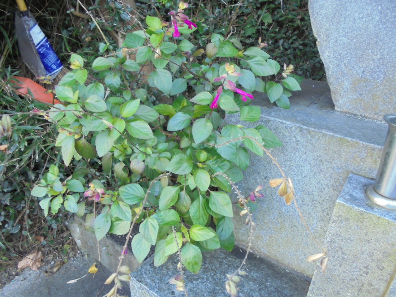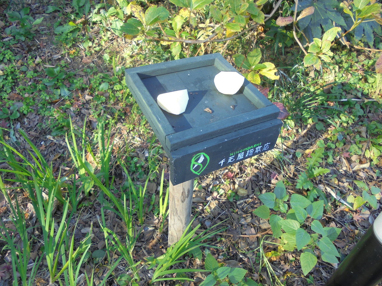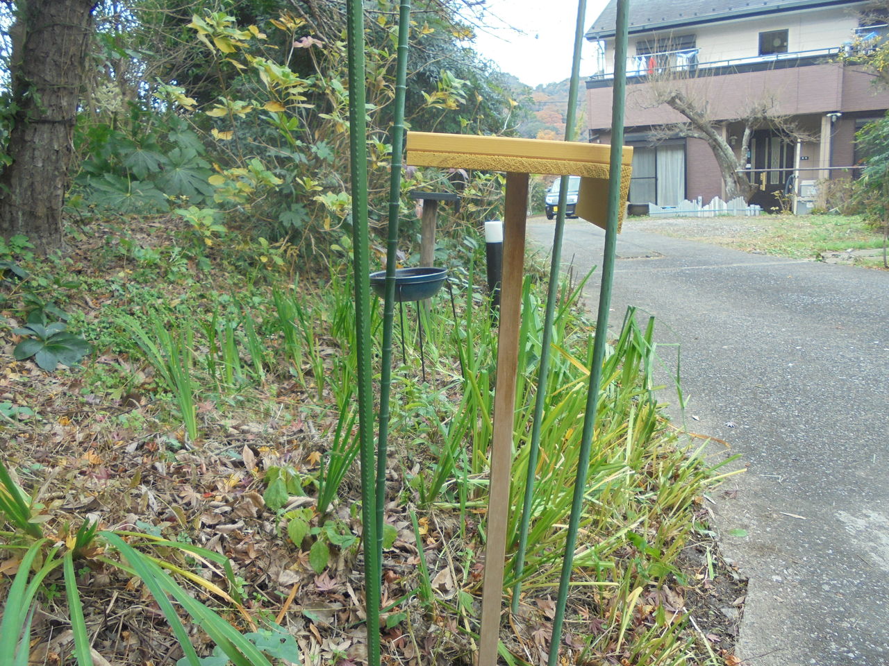 そんなある日、こともあろうにデニーズの台が地面に落ちていた。ご覧のように細い柱に釘で2ヶ所とめておいたのだが、釘が短かったせいか抜けていた。相当重量がかかった証拠だ。小鳥たちだったら重量がないから普通だったら落ちない筈。改めて足の長い釘を打ってしっかり固定した。縁起が悪いことにデニーズが傾いている。セットした時にはかなり慎重にセットして水平だった。何故傾いてしまうのだろう?