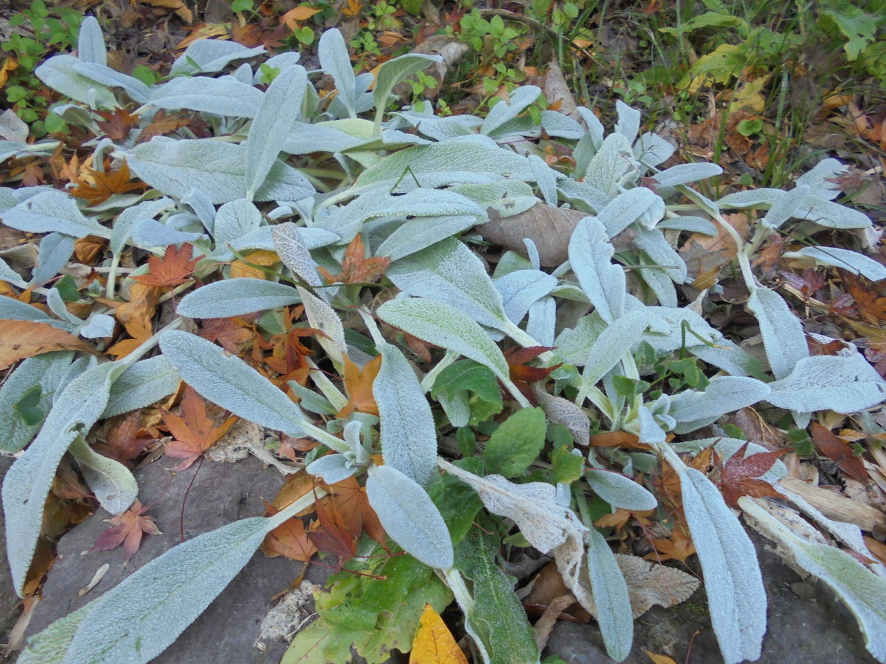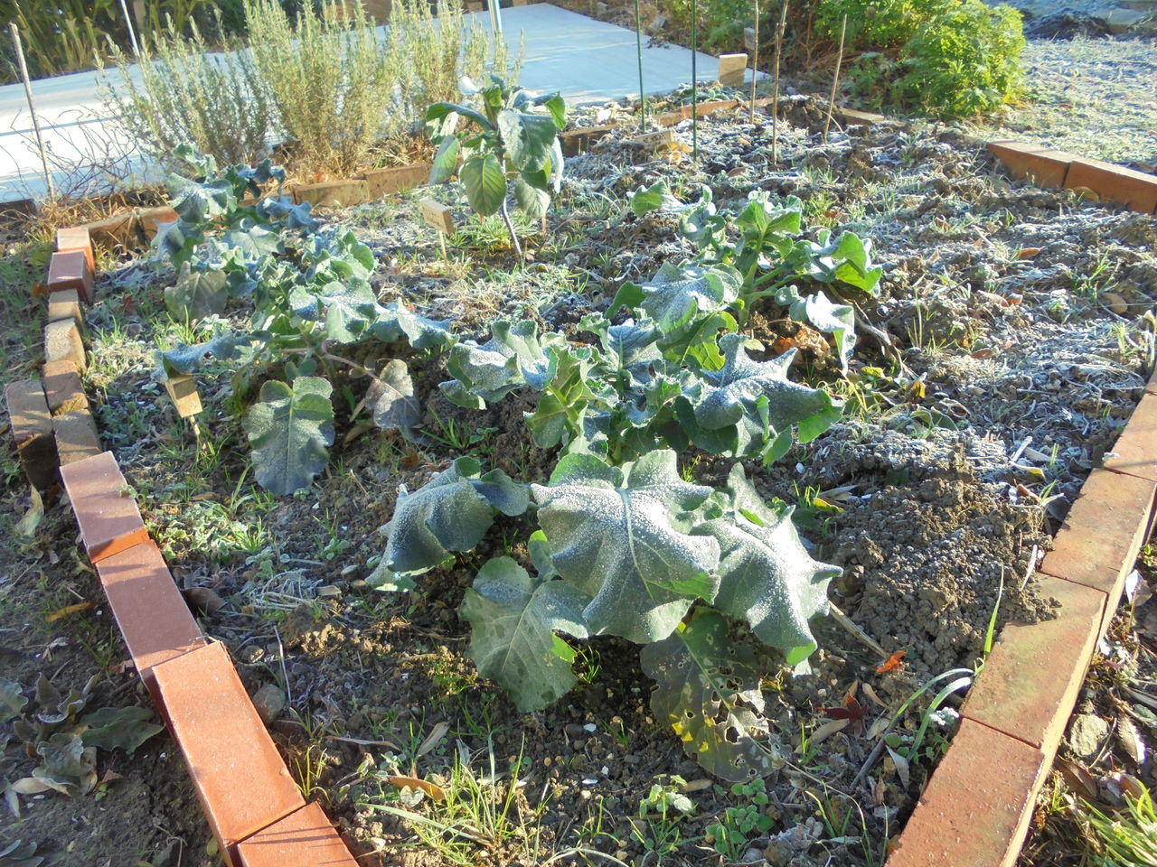 今年初めて植えたブロッコリーもカリフラワーも葉が真っ白になった。それでも日中になると朝の霜などまるでなかったかのように元気な姿に戻る。ラムズイヤー(下段中)はもともと寒そうに見えるから霜が降りようがびくともしない。