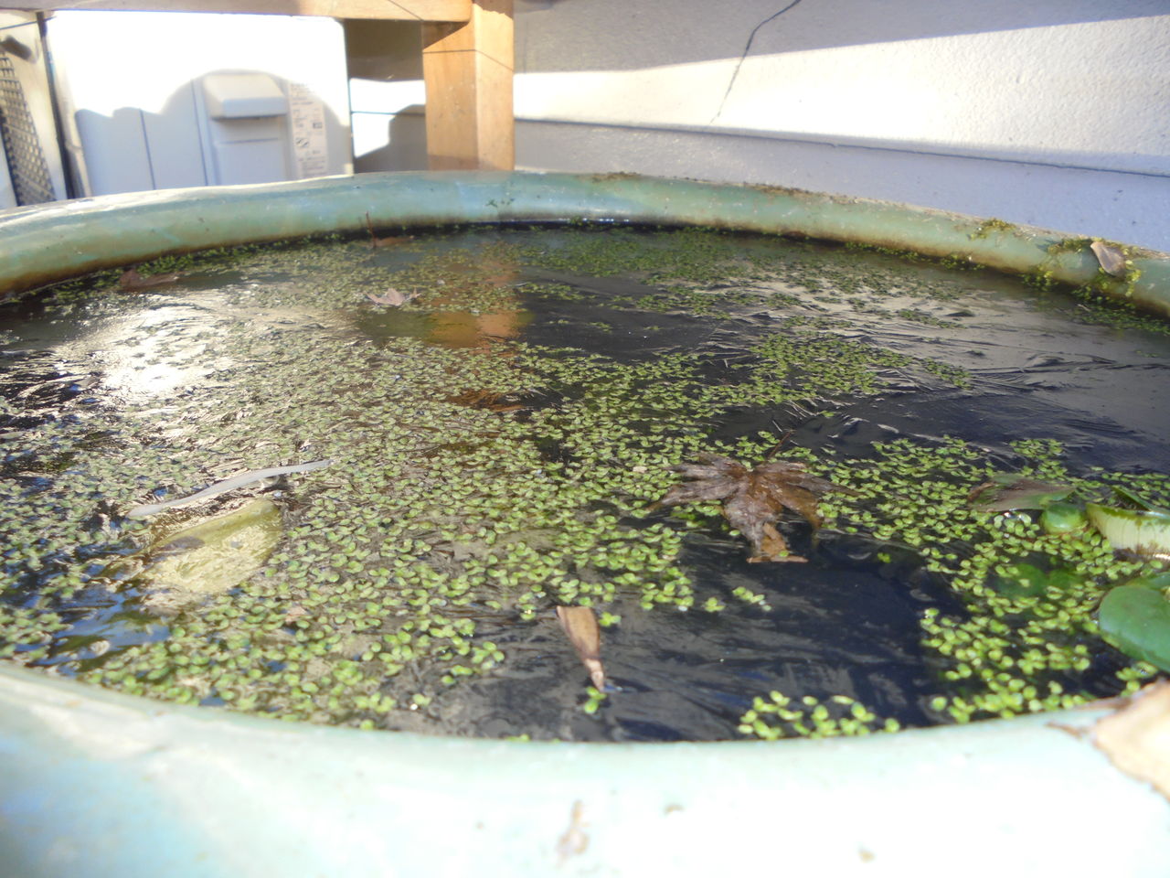 このところメダカ鉢にも氷が張るようになったがそれでもホテイアオイや水草が生きている。