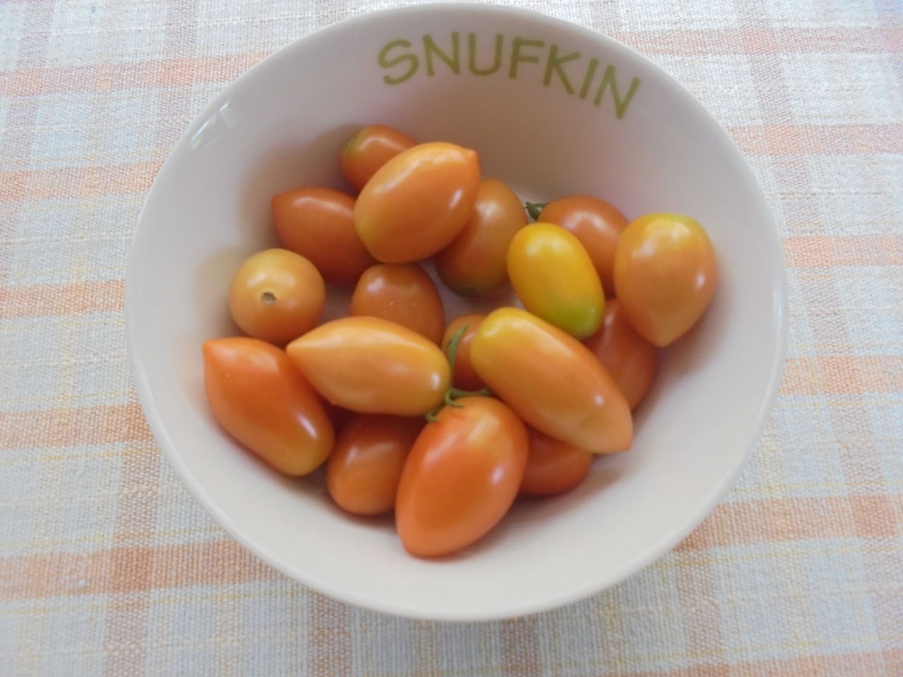花が咲く植物ばかりがテーマではあるが唯一食べることができるものを植える一角を設けていて、そこに毎年、ミニトマトを植えている。きっかけはお隣のご主人の勧め。今年は7本苗を買ってきて植えたが、何と寿命が長いのだろう。いつまで経ってもミニトマトの収穫が途切れない。収穫といってもご覧のような量だから食卓のサラダになるくらいの分量だが、栄養価が高いといわれているので毎日大事に食べている。今年のミニトマトはいろいろな種類の苗を買ったので丸いもの、少し大き目なもの、黄色いもの、どんぐりのような形をしたものなど多種多様。