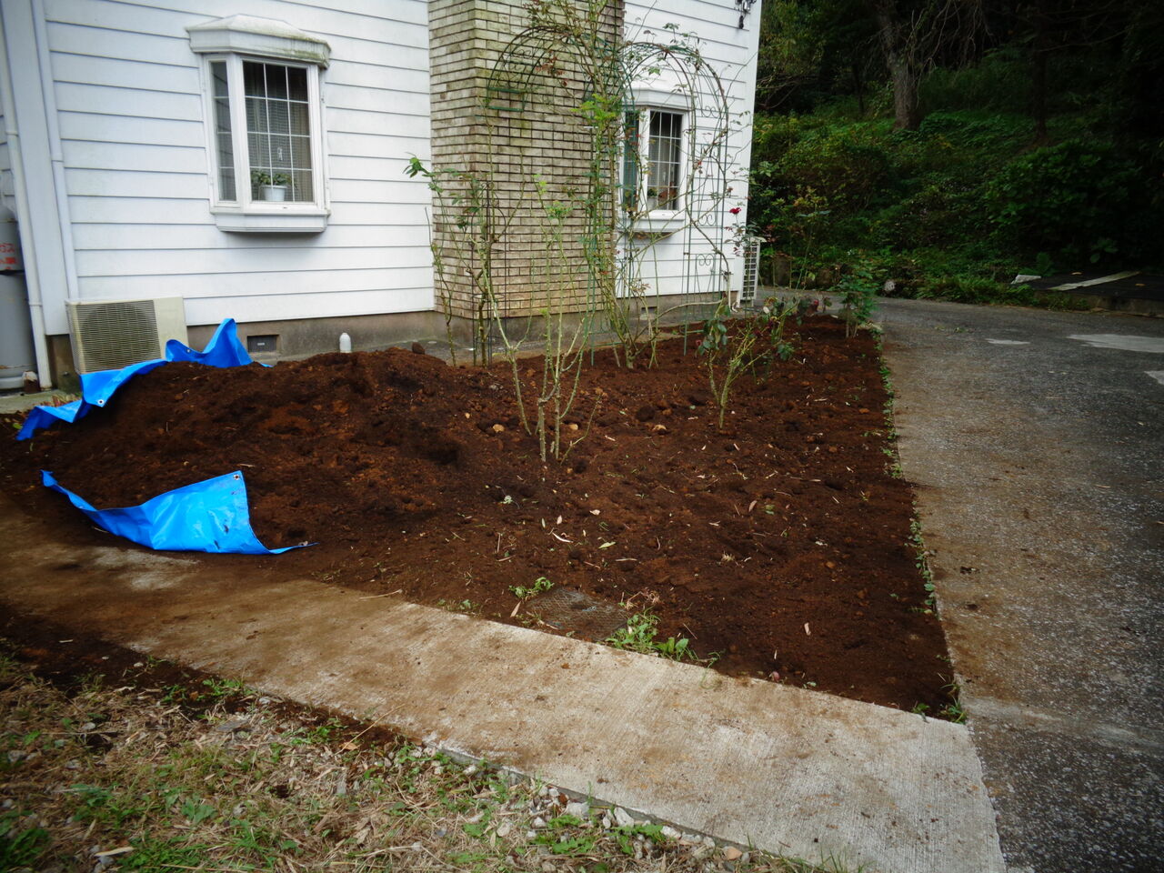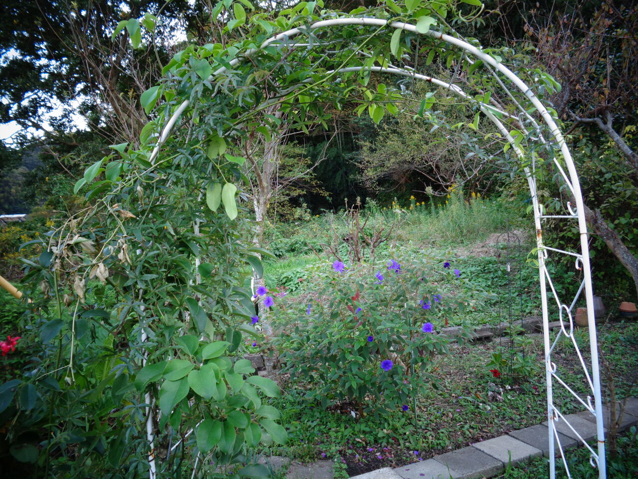 庭の中央にガーデンゲートがある。初めはこの場所にあった訳ではない。たまたまここに蔓ものを植えてしまったために、蔓を絡ませるつもりで移動した。その蔓ものとは「むべ」。本来は垣根などに這わせるのが良いのだが、生憎適当な垣根がなく、やむなく、このゲートに這わせることにした。そうこうしているうちに、むべとは違う葉が並ぶようになった。しかし、どこかで見たような蔓植物。初めは何か分からなかったが、今年の夏に時計草が咲いて正体が分った。かくて一つのアーチに2種類の蔓がからむことになってしまった。