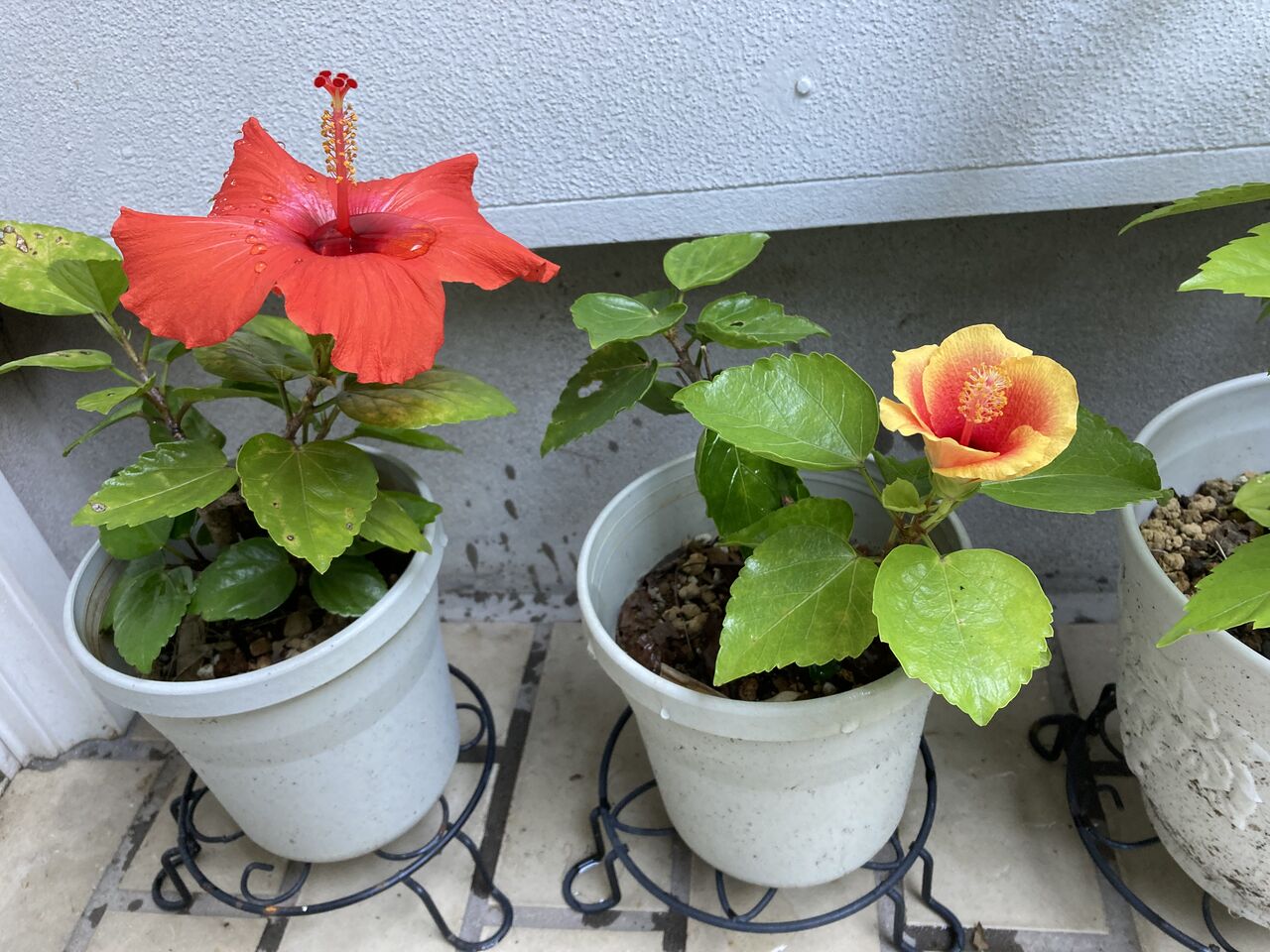 今年になってブログに10回目の登場。この2つの鉢は毎年、1鉢ずつ増やしていったので少し年齢がいっている。何年か冬を越し、その越冬準備の折りに剪定して背を小さくしてあるのだが、いつもだと夏までにもう少し成長するのが、今年はちっとも成長せず、まるで盆栽のようになってしまった。しかし、それに相応しく、ちょっと小ぶりの花が咲いた。右側の黄色いハイビスカスは遠慮がちに開きかけている。急激な寒さの中で急いで咲いたような風に見える。