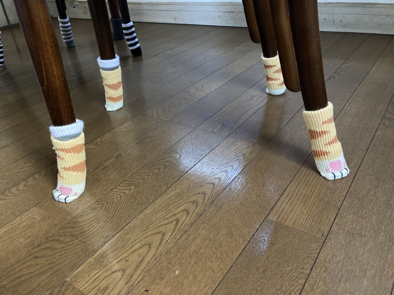 以前にも我が家のリビングの椅子の脚をアップしたことがある。床のキズを少しでも減らし、音も少なくするためにご覧のような毛糸で編んだソックスが売られている。良くあるのは100円ショップ。僕は体重があるから、僕が座る椅子のカバーは消耗が激しい。このカバーにいろいろな種類がある。以前アップしたソックスはシマウマのようなカバーだったが、今回、家内が買ってきたのは猫足。一番先が猫の足に見えるようにわざわざつま先を作ってある。