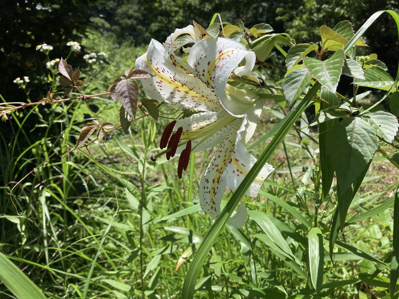 今年は自然に咲く山百合を楽しもうと、雑草も刈らずそのままにして育てた。いかにも山百合という感じに咲いたのだが、どの百合も色々な蔓が巻き付きついているのでちょっとした風ではびくともしない格好になっていた。自然は持ちつ持たれつで素晴らしい共同作業だと喜んだのも束の間・・・。