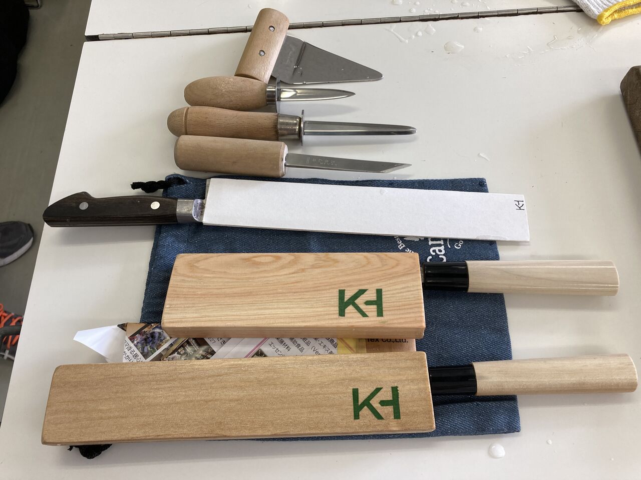 お魚の開き方教室に通ってくる仲間には色々な趣味の人がいる。調理台に並べてある包丁と貝むき。入会してから間もなく半年になる女性の道具。出刃、刺身包丁の木製カバーは手作りだ。先輩の仲間が持っているカバーを参考に作った。包丁の上に並んでいる色々な形の貝むきは普段、自宅で「牡蠣パーティー」をやっていて、揃えたものだそうだ。何故貝むきが沢山あるかと言うと、今年最後なので先生も最後に相応しい材料を用意しようと頑張って牡蠣を確保した。教室の限られた会費の中で調達するので、先生も大変な苦労をされた。最近はグループLINEを使って教室開催の前に確保したお魚の名前を写真入りで予告してくれる。だから参加者はいろいろと夢を馳せる。