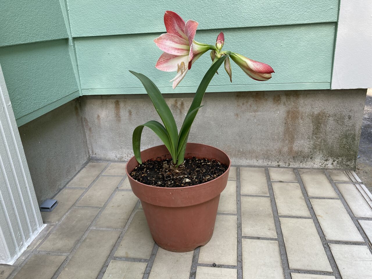 いただいた時にはアマリリスの大きな花が2つ咲いていたが、あっという間に3つ目の花が咲いた。プレゼントしてくれたご本人は2つの花しか見ていないから、3つ目の花を写真に撮り、ハガキにプリントしてお送りした。