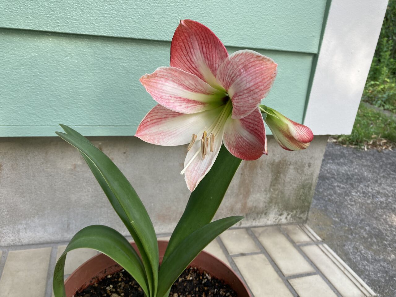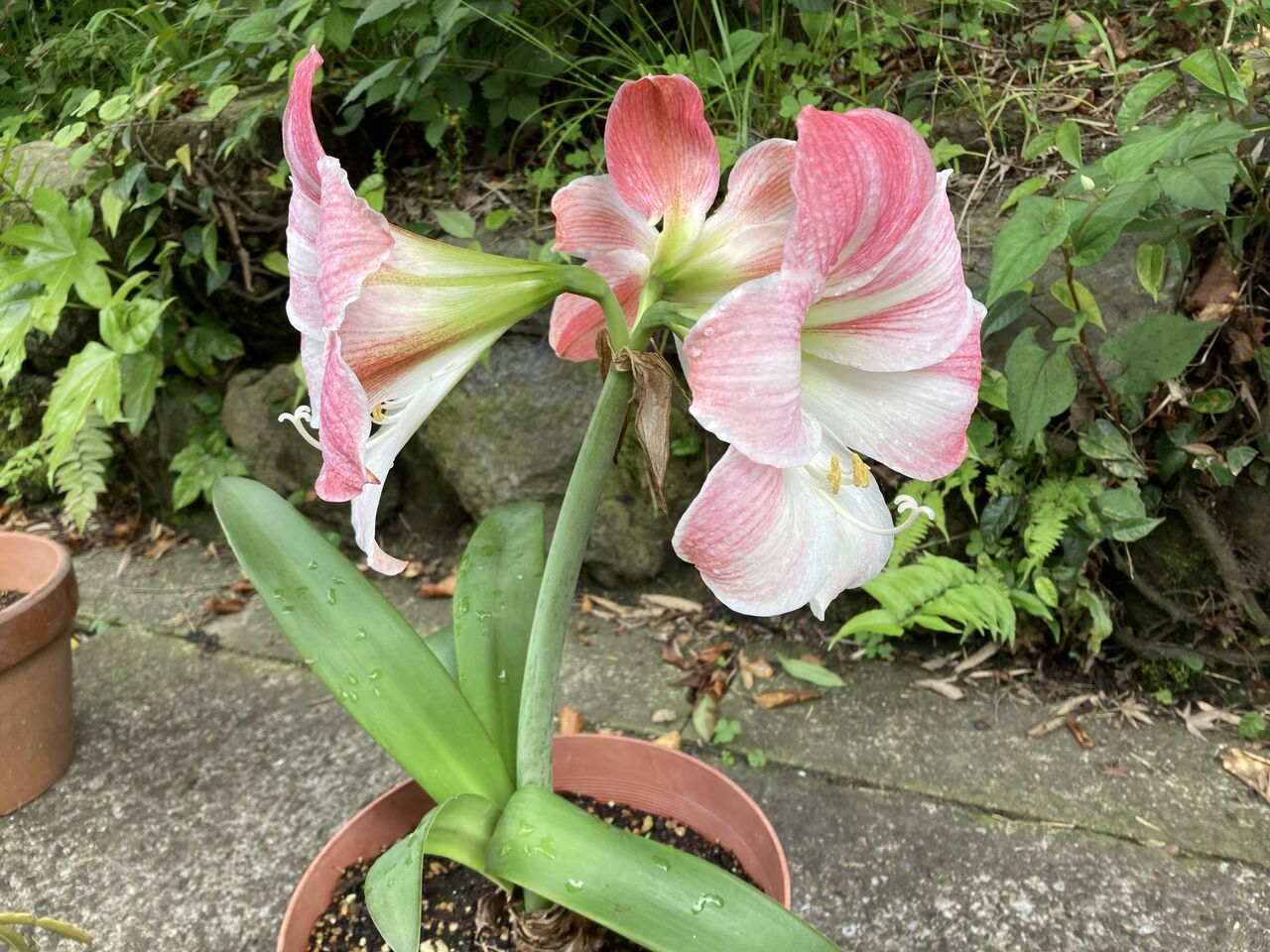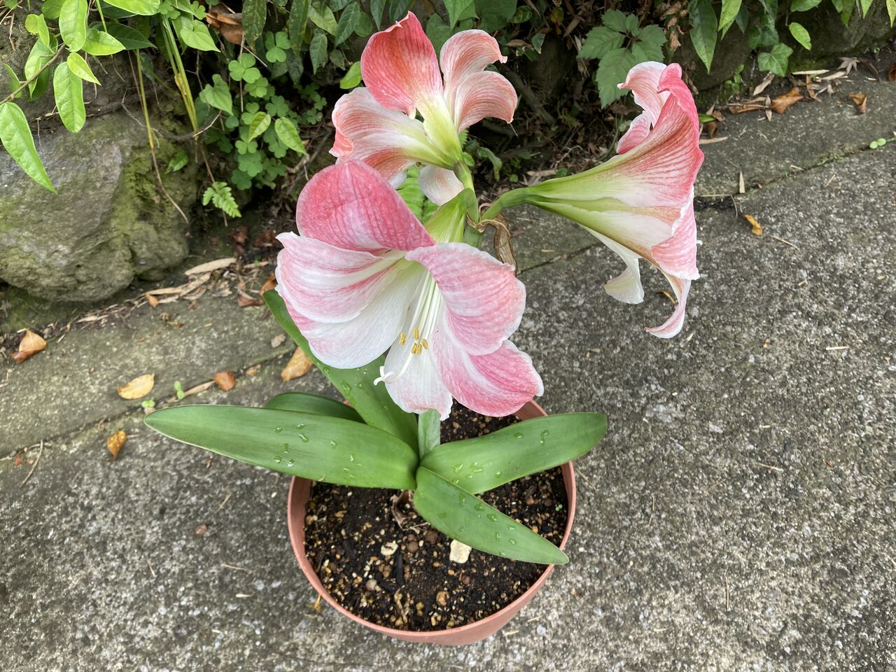 原因不明で身体の半身が不自由になってしまった高校時代のクラスメイト。ラクビー部に所属していて、一緒に活動した仲間だ。身体が不調になってから自宅の庭で植物を育てることを趣味にしている。普段家の中では車椅子生活なのだが、昔から腕っぷしが強く、普通では考えられないが、自分で外に出て庭で鉢植えの世話をする。庭を耕したりは出来ないので、鉢植えだったら面倒を見ることが出来ることが分かった。だから庭中に沢山の鉢が並んでいる。そんな彼が僕にお嬢さんを介してアマリリスをプレゼントしてくれた。その経緯は5月22日「友だちの育てたアマリリス」にアップした。