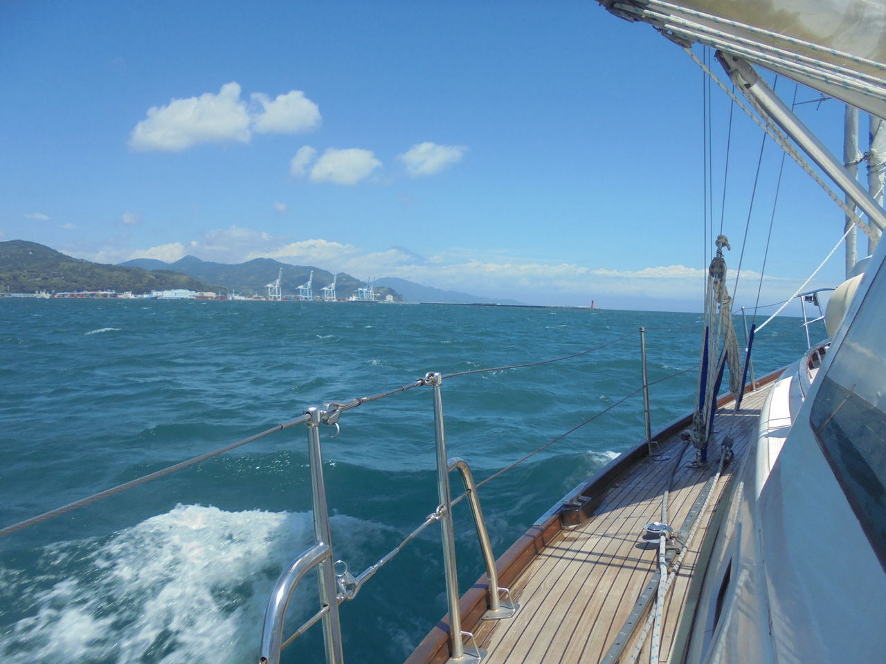台風の余波があり、港の中は静かだったが外はかなり波が残り風もマックスで17~18mの予報がでていた。オーナーは初めから強風を予想して2ポイントリーフ(縮帆)をセットしていた。