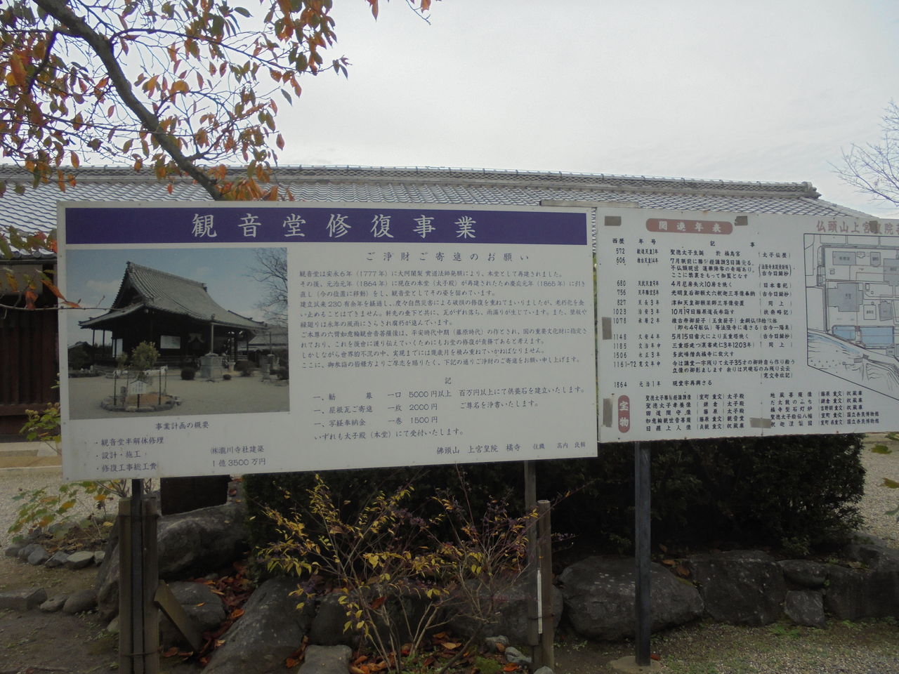 橘寺は今もお世話になっている聖徳太子の生誕の地とされているところだ。明日香村の天台宗のお寺だ。正称は上宮皇院菩提寺。606年に聖徳太子が建てたと伝えられているが、本当は天智天皇の頃のものだということが分かっている。ここが歴史の面白いところ。その後、荒廃してしまったが、幕末から明治初年になって再興したものだそうだ。今また観音堂の修復工事が計画されていて、浄財を集めていた。目標額一億三千五百万円。聖徳太子だったら集まりそうな気がするが・・・。僕たちは僅かなおさい銭のみだったが。