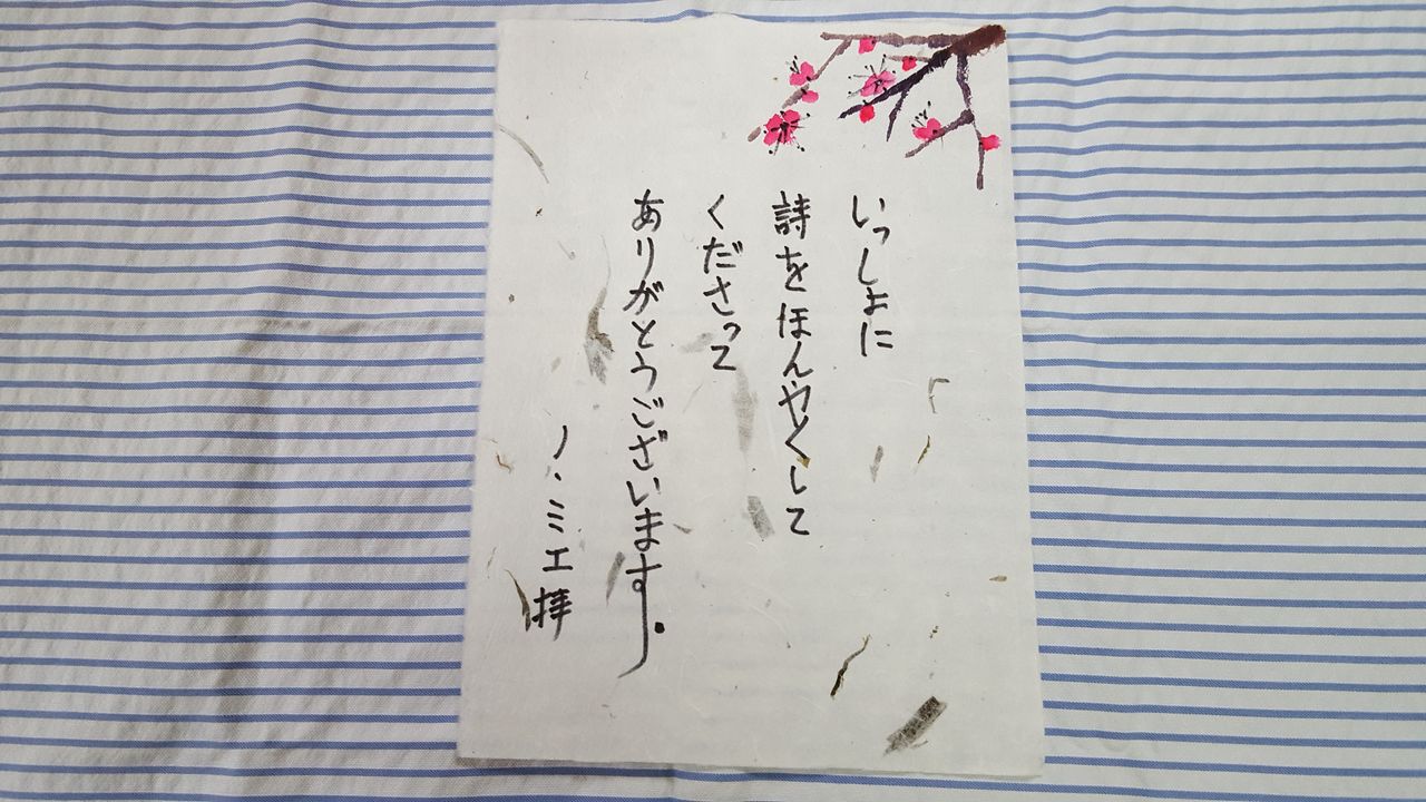 今年の10月11日のブログに詩を翻訳した話を載せてある。夏に韓国の日本語勉強会グループの一人ノミエさんから詩が送られてきた。その詩を翻訳をして欲しいとリクエスト付き。初めは恐れ多く躊躇していたが、ノミエさんの詩に取り組んだ姿勢を何度も何度も伺って日本語に翻訳してみた。ノミエさんも日本語を一所懸命勉強していて、その実力は大したものだから、僕などに依頼しなくても充分日本語に訳せる。敢えて僕との共同作業を望んだ背景には日韓の交流会でこの詩を発表することが決まったからだった。苦心の挙句出来上がった拙い僕の日本語訳をとても気に入ってくれ、目下認知症で老人ホームに入っていられるお母さんの若かりし頃の写真に詩を刷りこみ送ってきてくれた。