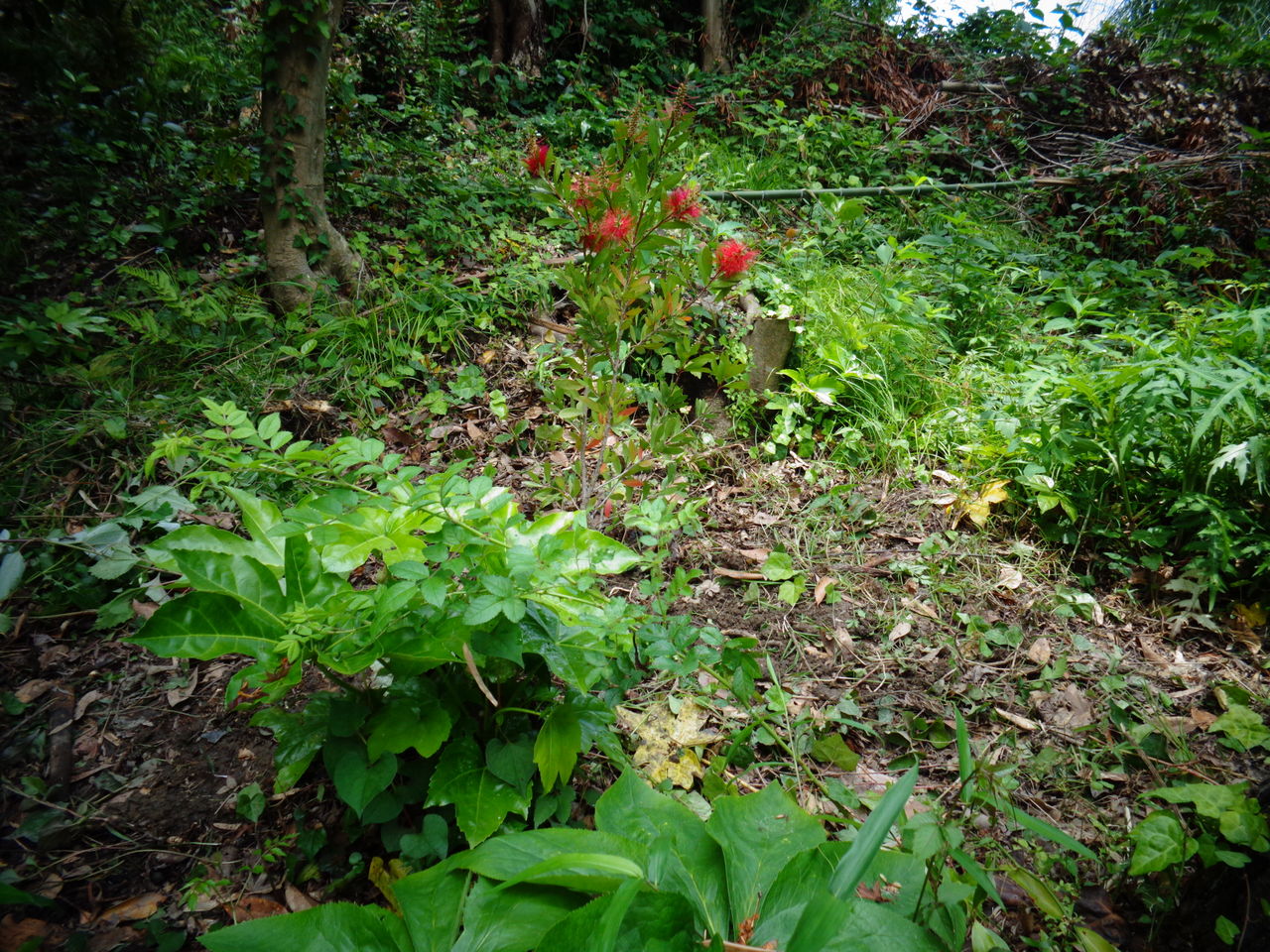 宅配便で届いたブラシの木。取り敢えずお天気も悪くまた1日暗い箱の中に入っていたので、光に慣らすように1日少し薄暗いところに置いておいた。そして、玄関前に出したのだが、どうもポットが不安定で、ちょとした風でフラフラしていた。折角真っ赤な花が咲いているので、倒れて枝を折ってしまってももったいないと思い予定地に植えることにした。本当は作業を夕方に予定していたのだがポットがフラフラして「早く植えて!」と催促しているかのよう。一緒に付いてきた説明書きを参考に地面に大きめの穴を掘り、腐葉土と赤玉土を用意して植えようとしたのだが、ポットからブラシの木が全然抜けない。普通、ポットの苗を植える時には底側をポンポンと叩けば簡単に苗がポットから抜ける。ところがこのブラシの木ときたら全く抜けなかった。ポットをよくよく見たら底が細かな編み目状。その網に根がしっかりと絡みつき、ポットの底が平ではなく、根でこんもりと盛り上がっていた。よほど長い間窮屈なポットで育てられたのだろう。これではポットが立たない訳だ。止むを得ずポットを壊して苗を出した。そしてクリスマスローズの丘のその上に植えた。お隣にはオオデマリの木が植えてあるので白い花が満開になった後に真っ赤なブラシの花が咲く予定。果たして計画通りになるか?