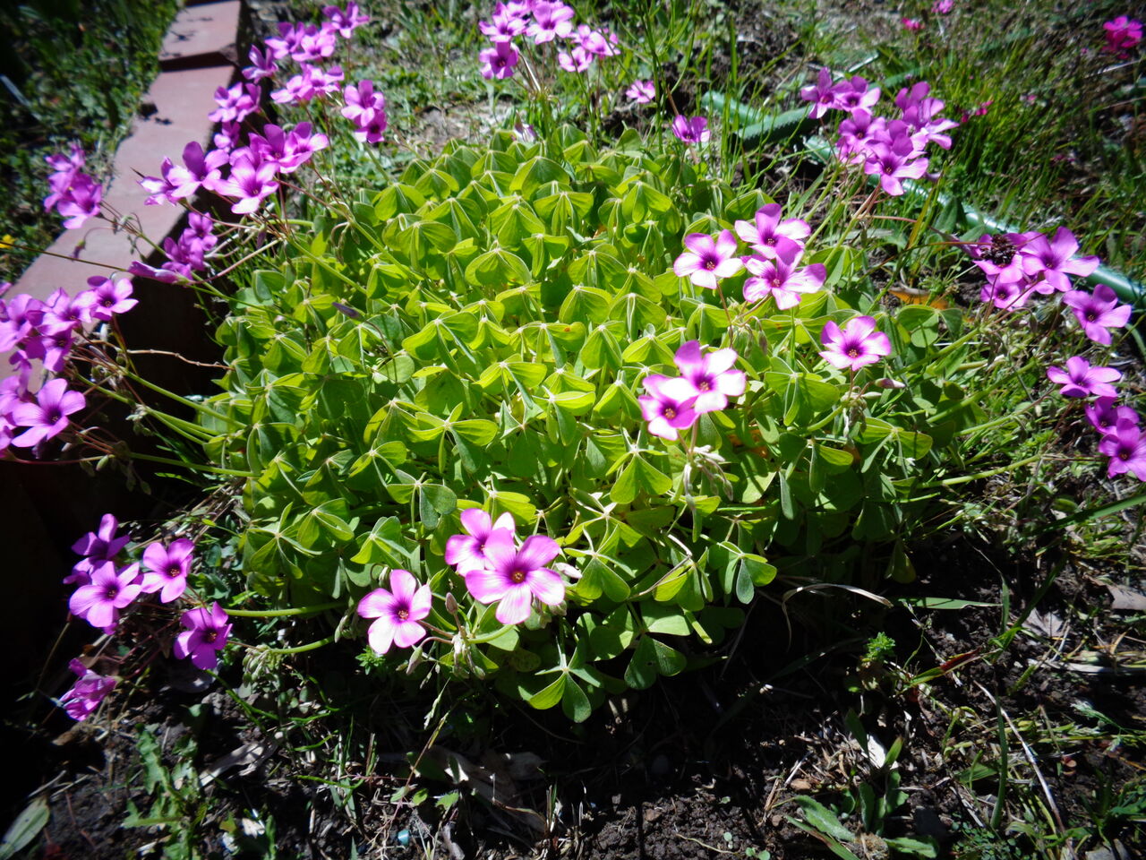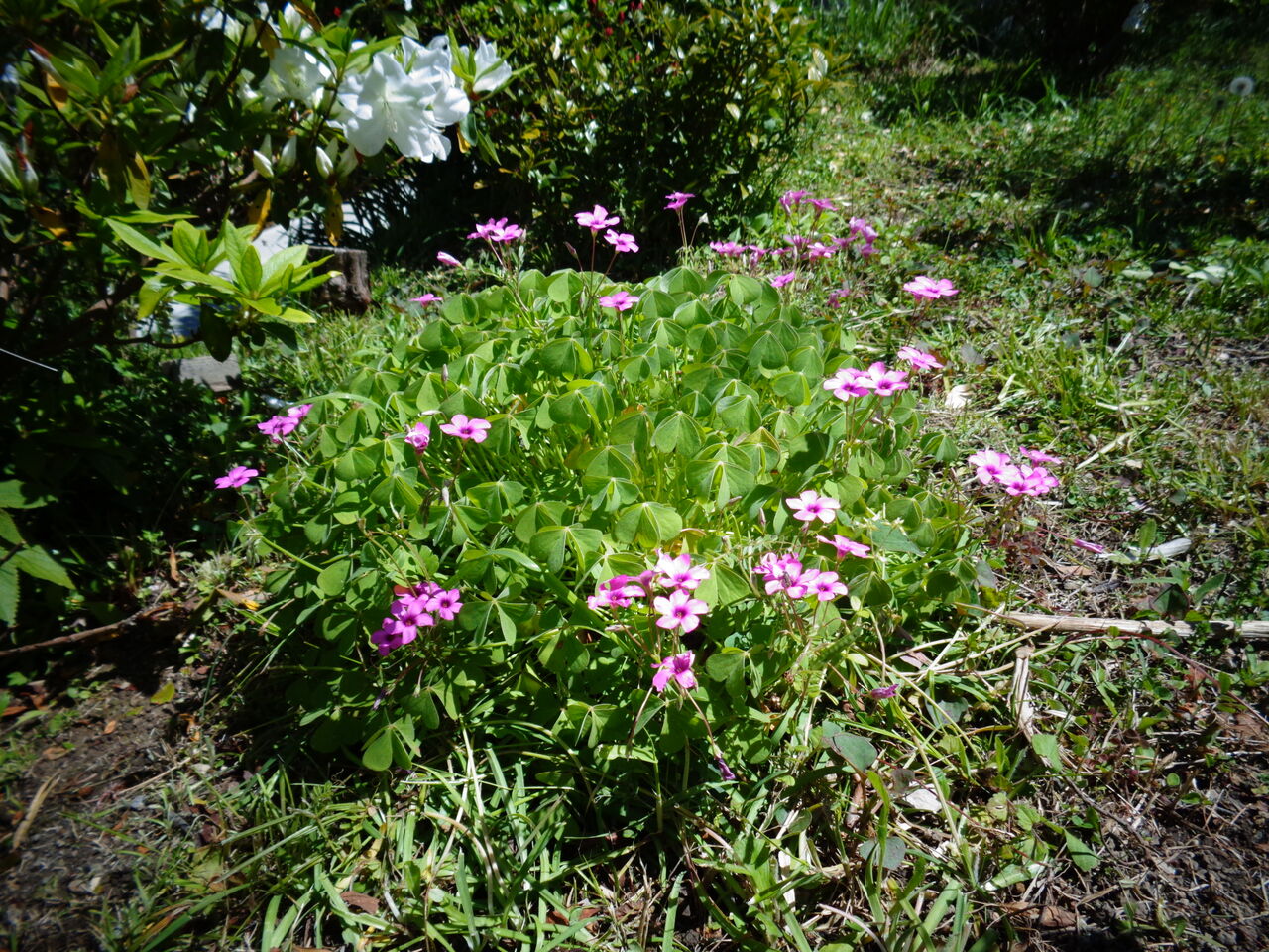 たまたまホワイトジンジャーの株を取りに来た親友が名前を教えてくれた。オキザリスというグループの植物で、このピンクの花はイモカタバミとうことが分かった。もともとは外来植物。