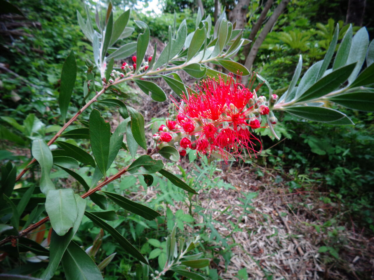 ブラシの木に赤い蕾が出来たと思ったら、何と早いこと。ご覧のような派手な赤いブラシがいきなり登場した。この他にも、それぞれの枝の先に真っ赤な蕾が見えるから、これから次々にブラシ状の花が咲く。長い間待っていたので、喜び勇んで花の側に近づいて見ていたら、手の甲を蚊に刺された。今年初めての蚊。油断も隙もない。