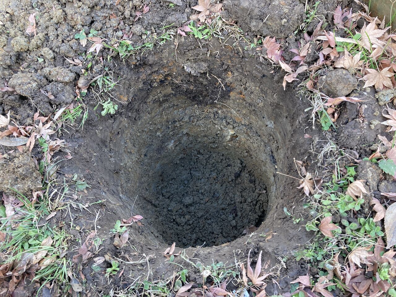 重い腰を上げて穴掘りを敢行した。ミラコンポを埋めるために少なくも80cm以上の穴を掘らなければならない。最近はモグラがあちこちにボタ山を作っているが、人間がやるとそうは簡単にいかない。