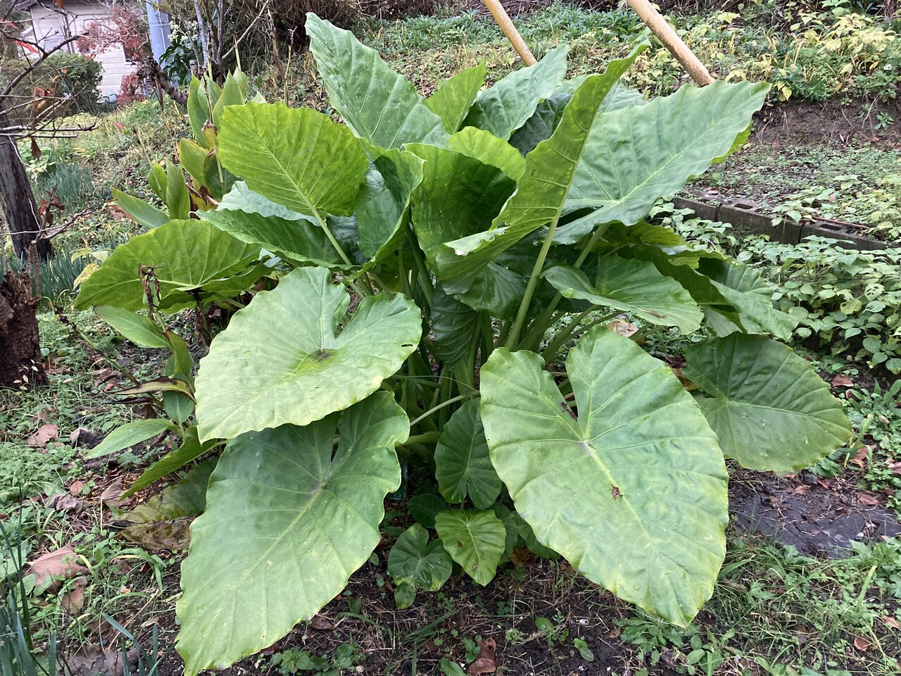 本来は暖かな地方に育つはずのクワズイモがこのところ寒い朝を体験している。