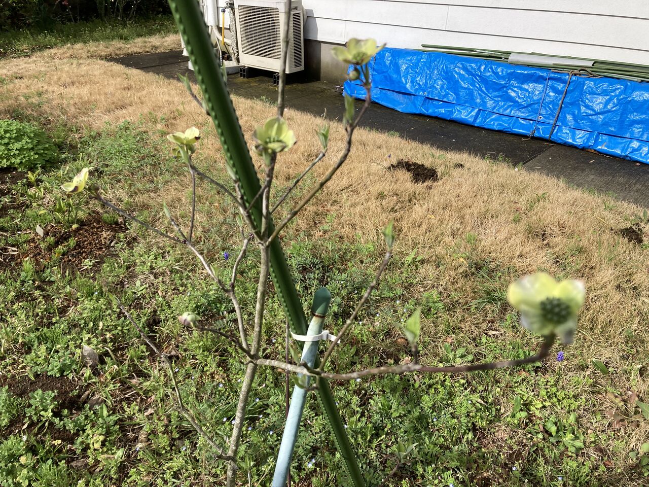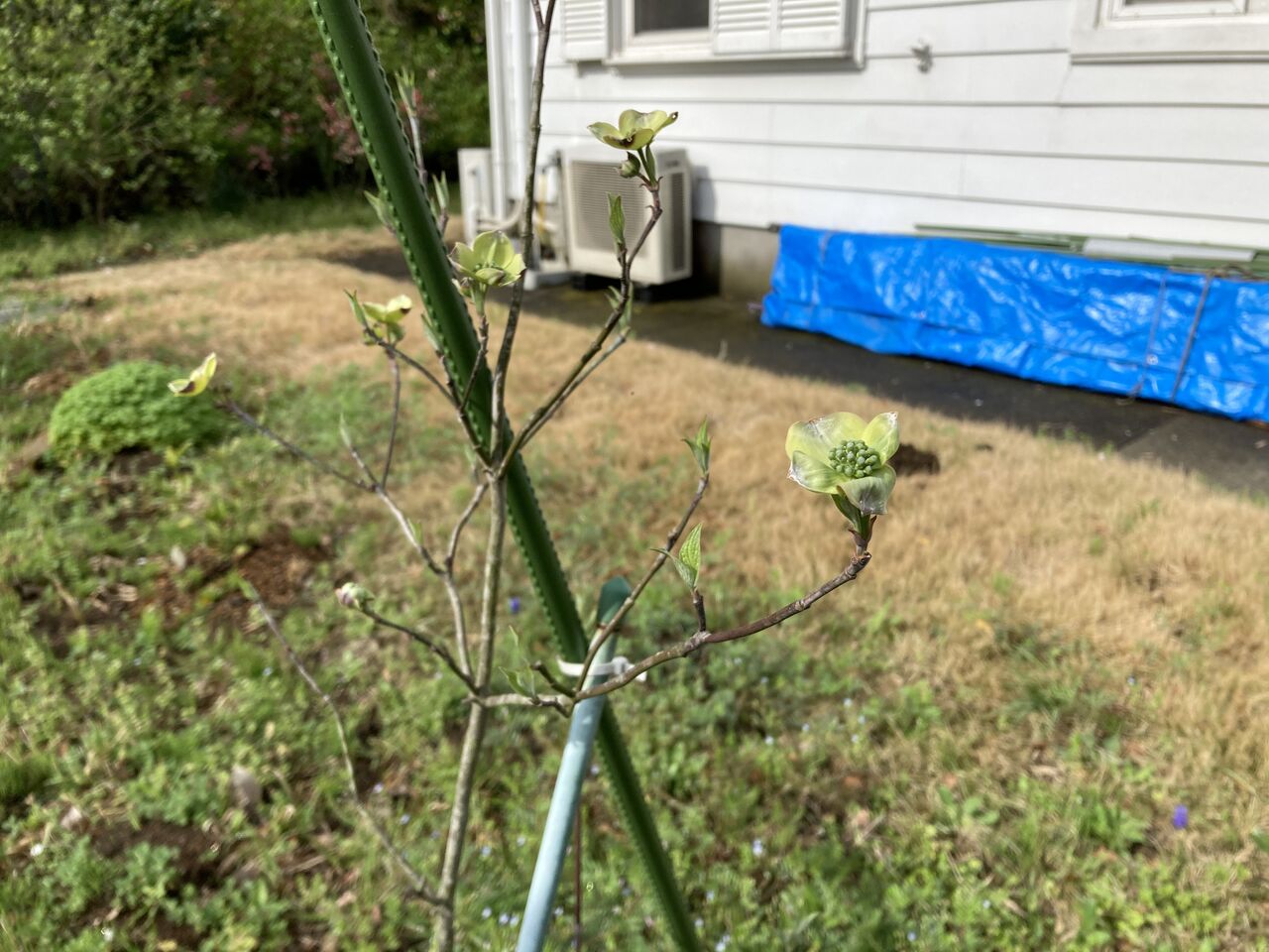 土が悪いことは分かっていたので、新しい土を入れたり肥料も昨年は何度かプレゼントしたのだが、あまり変化がない。いっそうのこと掘り返して場所を変えようかとも思っているのだが、希望としては今の位置には育ってくれるとバランスがよさそうだと思っているから、なかなか移住させる気持ちにならない。そんな悩みをオーナーが持っているとも知らず、今年もささやかにハナミズキの花がパラパラと咲きだした。
