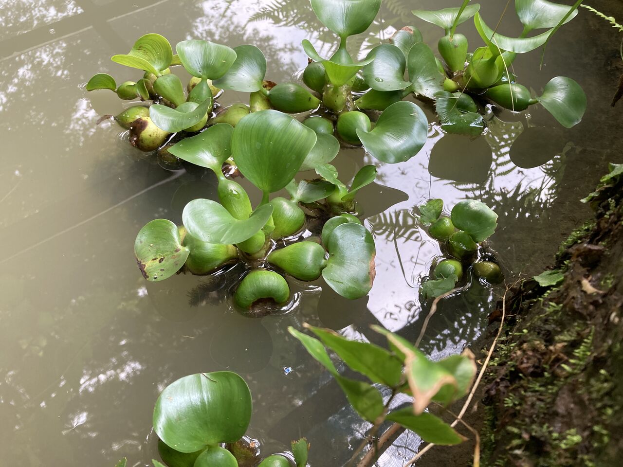 一方、池のホテイアオイは半日陰に育っているせいか濃いグリーン色。(下段右)