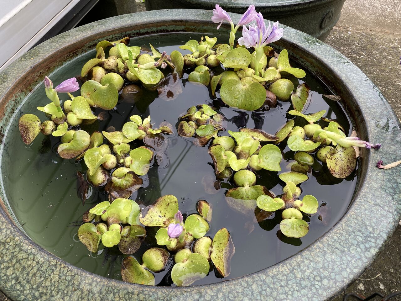 本来は池で育てるホテイアオイ。金魚が食べてしまうので睡蓮鉢で予備軍を育てている。