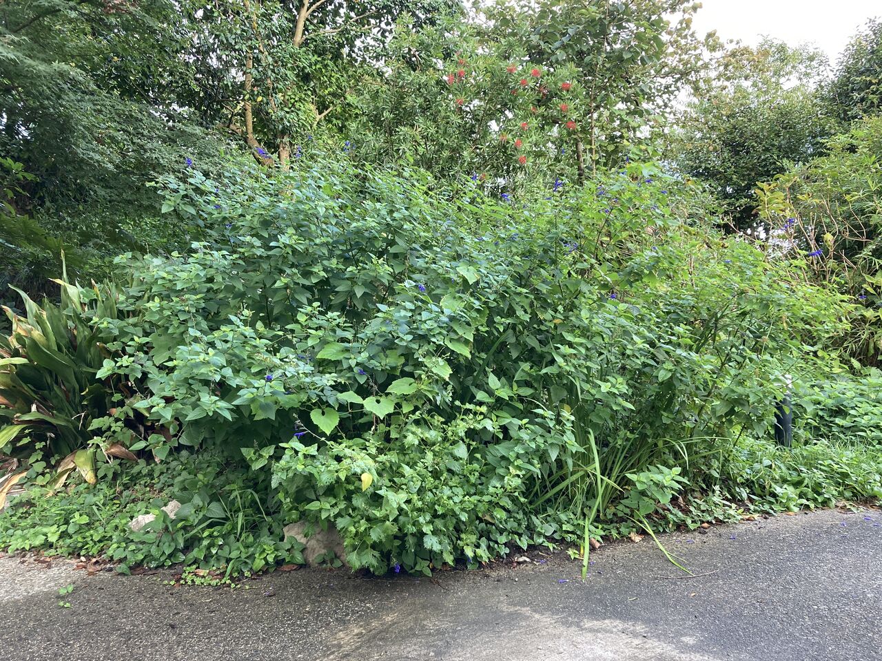 駐車スペースの直ぐ横はブルーセージが我が物顔だ。青紫で穂状に咲く姿が真夏にはとても新鮮に見えるのでスペースを確保しているのだが、何も手をかけずにおいていたら、伸びること伸びること。背丈も2mを越えてしまった。ちょっと伸びすぎだ。この猛暑の中で緑のスペースが増えるのは気持ちが良いんものだが、実は我が家では変な副作用が生じる。