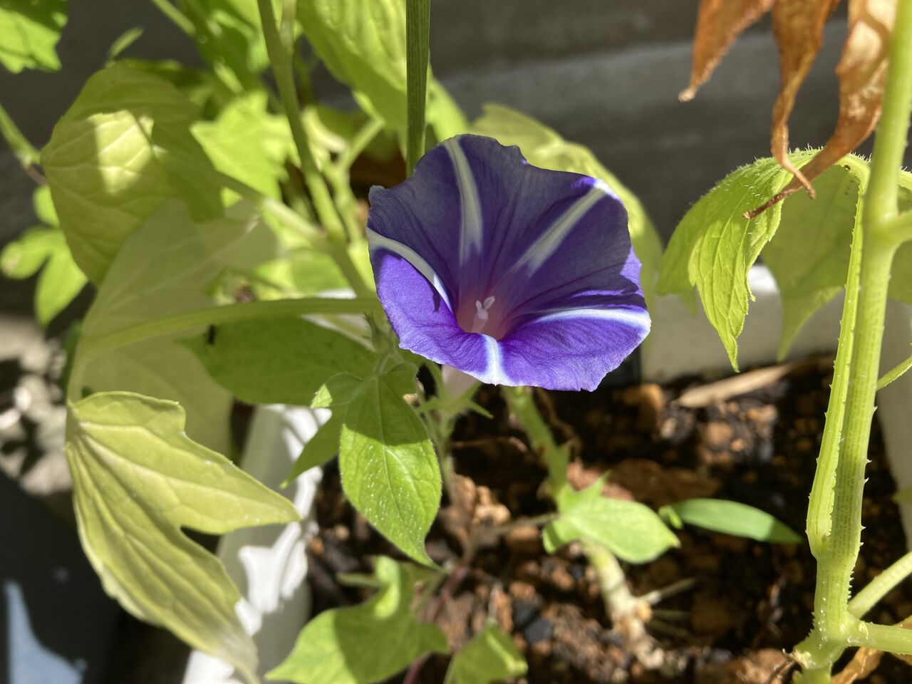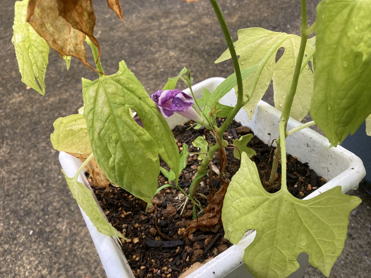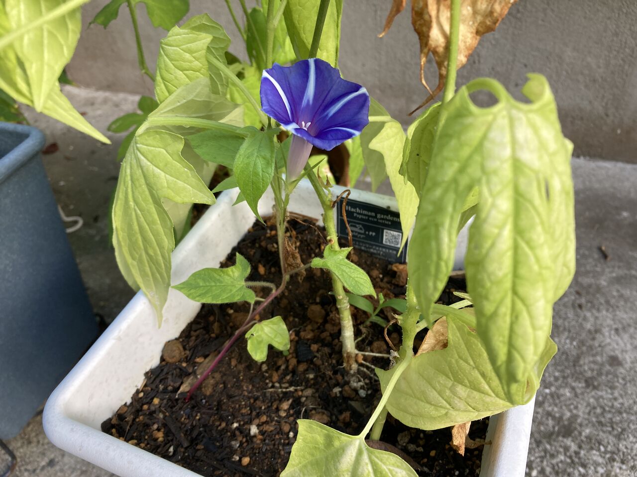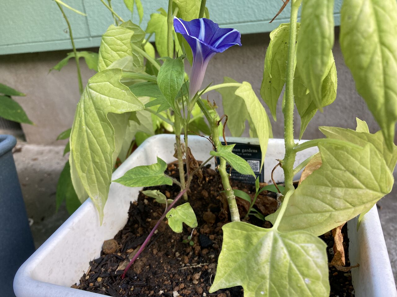 オキナワスズメウリの鉢に間借りしていた朝顔が咲いた。