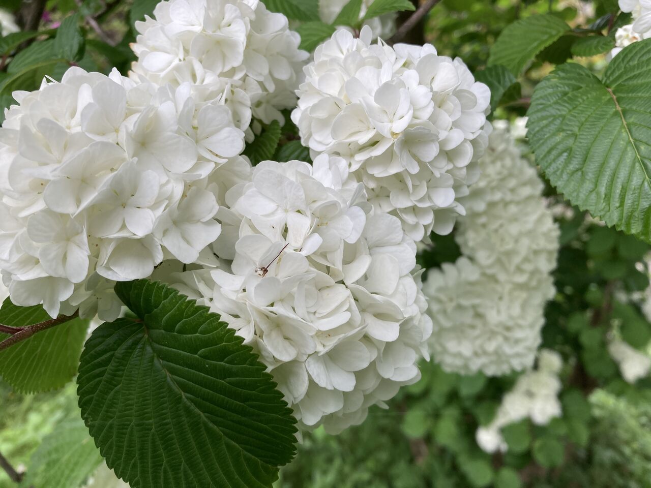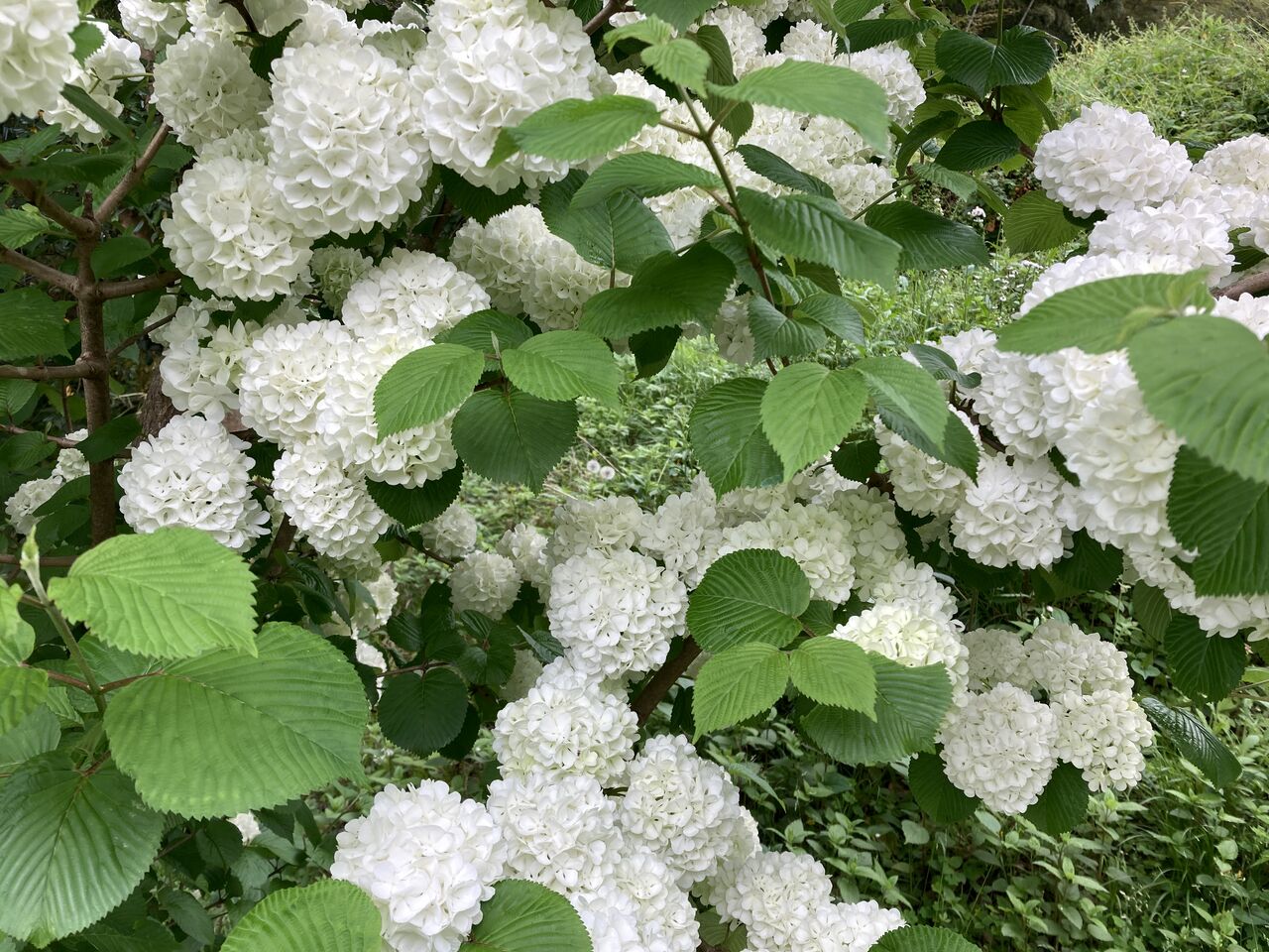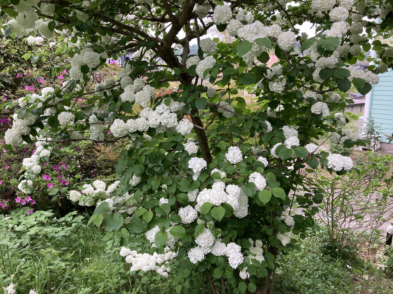 卯月の最後を白いオオデマリで締めくくることが出来た。花の数を数えていないから何とも言えないが、数えきれないという言葉がぴったり。花だけの重量を計ったら相当な重さがあるだろうと想像した。先日のブログにも書いたが、オオデマリを植えてから長い間大事にしてきたメインの枝を花が終わってから切った。メインの枝が花の重さで弓なりになり、枝の先端が斜面の地面についてしまうほど。