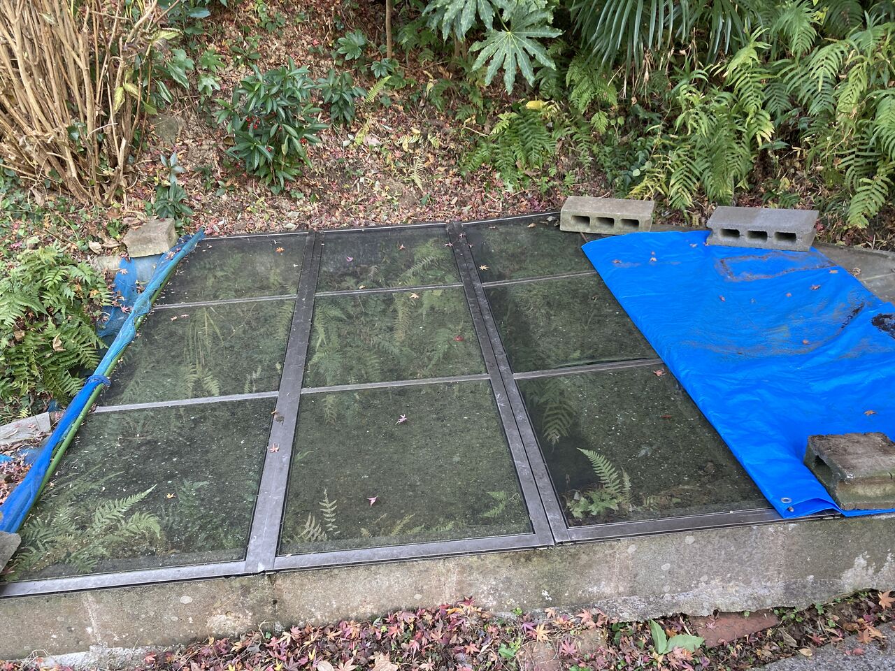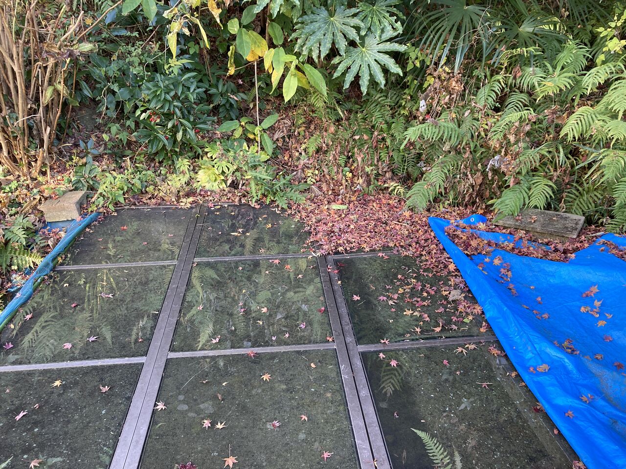 掃除の前には網戸の右上に溜まった状態が3枚の網戸全面に拡がっていて、枯葉で池が見えなかった。網戸を外し、箒で掃いて少しすっきり!(下段右)
