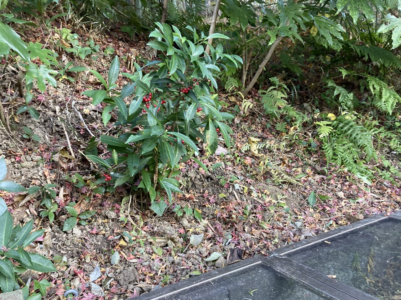 ついでに気になっていた池の周りの大掃除を実施。池のすぐ上に育っているマンリョウ(下段左)を残し、周りの雑草を刈りこんで年末の大掃除完了。