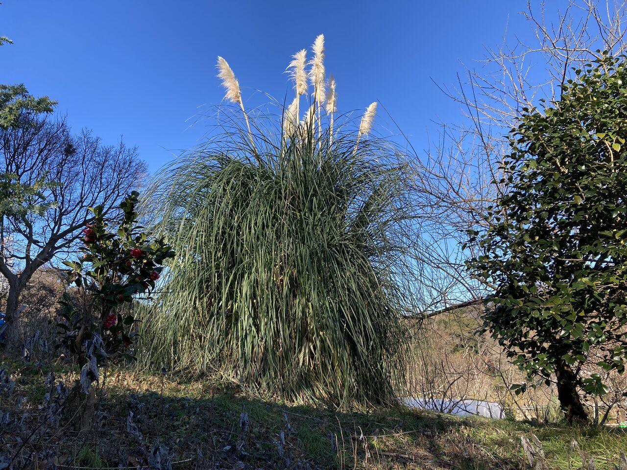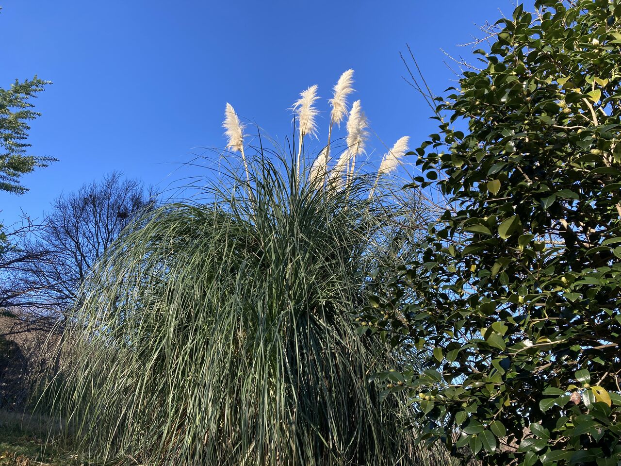 青空を背景にまるでほこり取りのモップのような形のパンパスグラス。ススキの親分のような姿形をしている。原産地は南アメリカ、ニュージーランド、ニューギニアと言われると「な~るほど」と納得できる感じだ。
