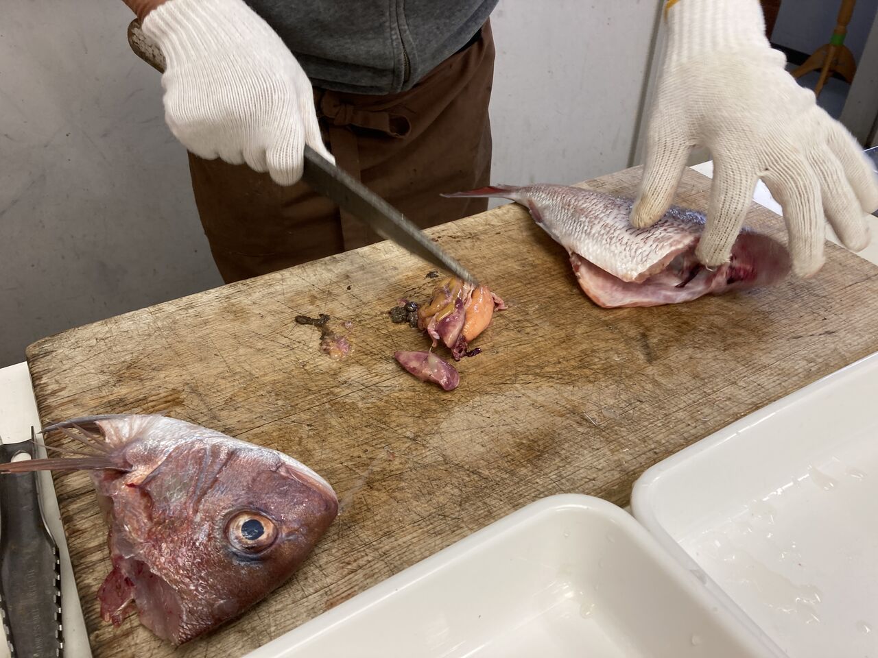 下段左のホワイトボードの写真を見ていただくと、今回のお魚の種類が分かる。メインは三重県産の天然の鯛。トレーに入りきらない大きな鯛。うろこが僕の親指ほどもあり、取るのに一苦労した。