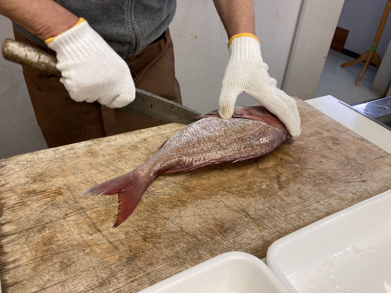 今回は予算の関係で一人半身ずつ。新鮮な天然の鯛が半身でもこんな贅沢なことはない。