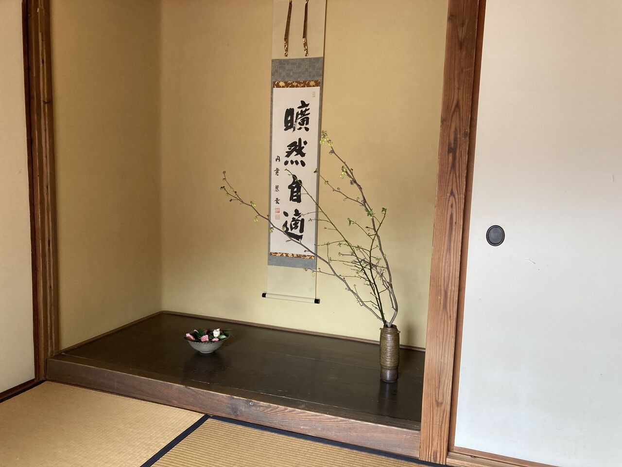 今回の軸は先代の円覚寺足立管長の軸。禅語で「曠然自適」と書かれている。禅語の中の「松老雲閑 曠然自適」からとられ、老いた松のように静かに流れる雲のような心境でおおらかに心に任せて悠々と生きるという意味だと住職さんから説明を受けた。
