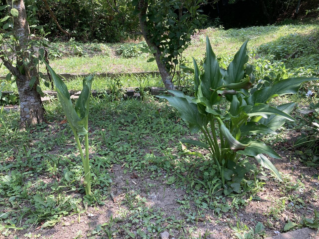 西側の斜面地に顔を出したカラーは初め雑草の中に隠れていた。猛暑続きでなかなか雑草刈が出来ず、雑草を刈ったらやっと株を確認できたという始末。ちょっと草臥れている感じだ。(下段の写真)