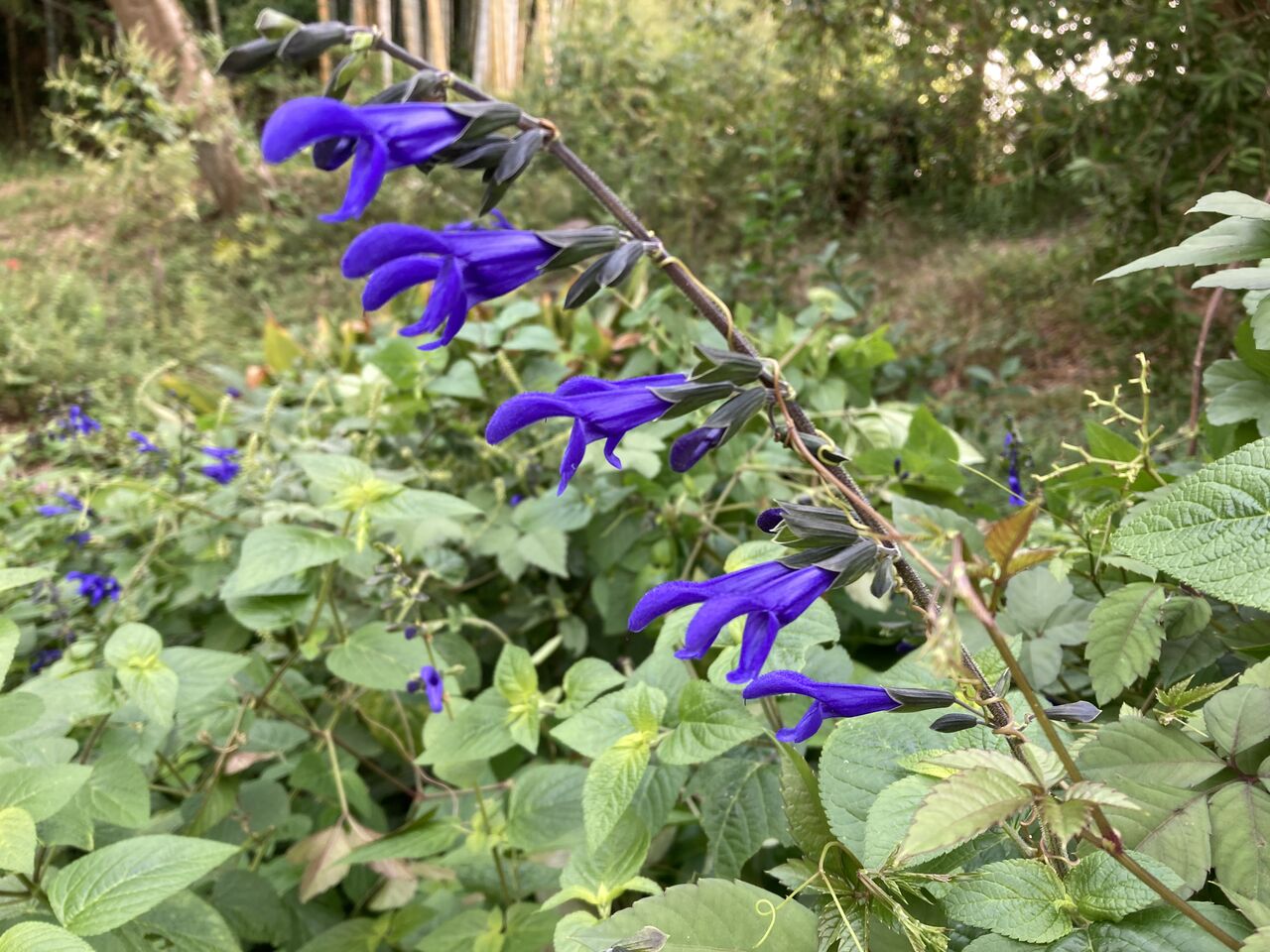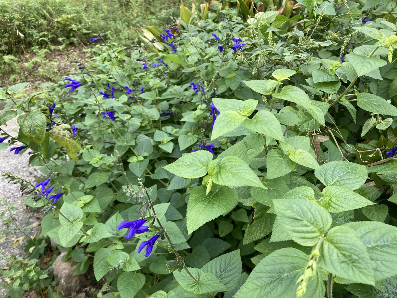 メドーセージと言う名前は日本国内しか通用しないネーミング。だからいつも( )付きで別名が書かれている。よく書かれているのがサルビア・ガラニチカ。言われてみればそう見えるシソ科の多年草だ。花色が濃い青紫。サルビア・ガラニチカと言うだけあって、サルビアに似ている。萼が黒いのが特徴だ。アメジストセージのようにずっと伸びた茎に縦に連なるように10輪前後の花を咲かせる。沢山連なるととても涼し気に見える。