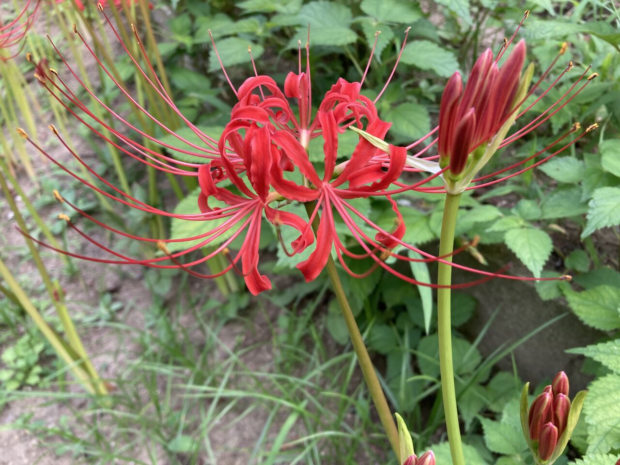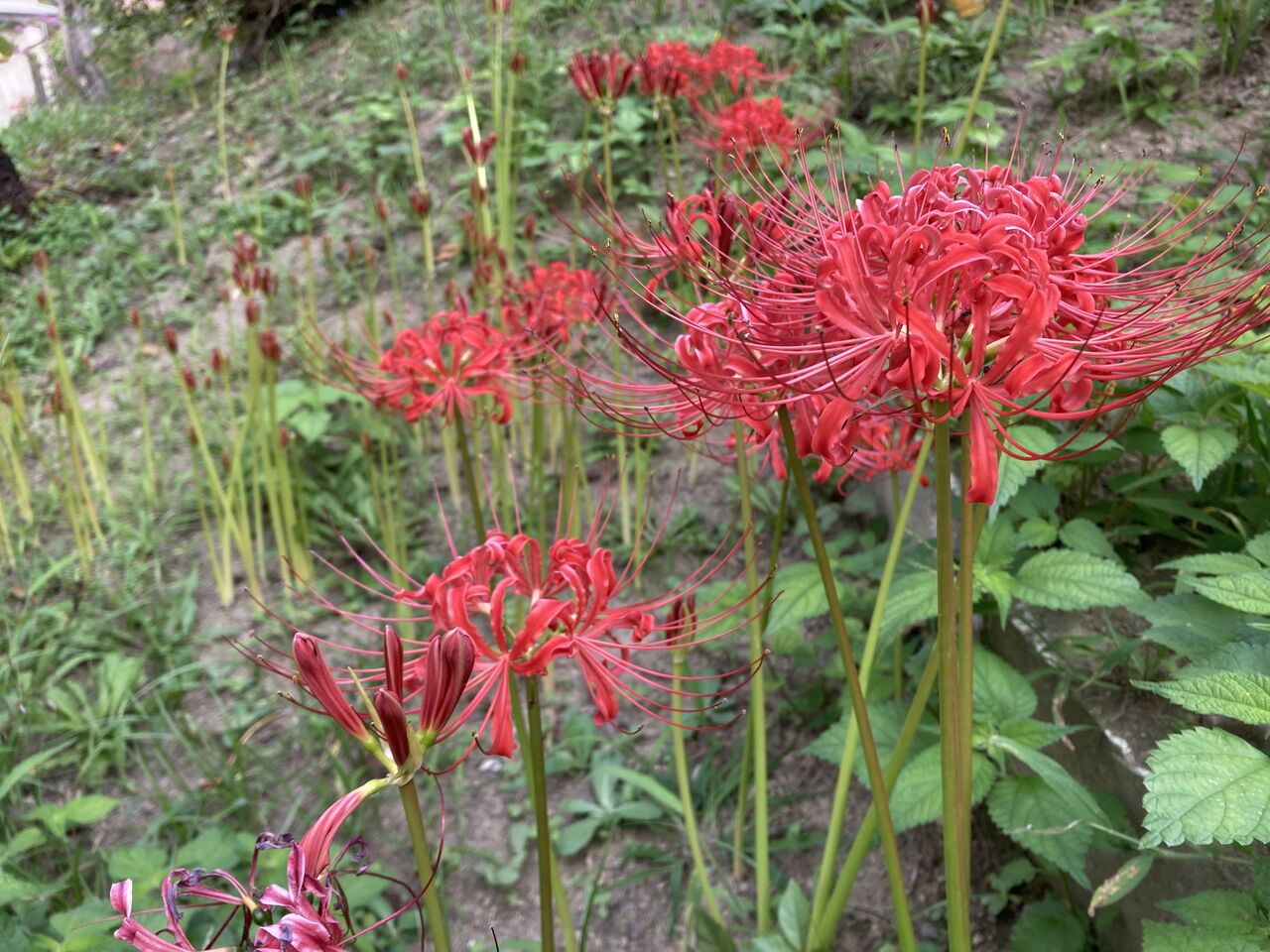 その雑草の中に彼岸の入りに間に合ったヒガンバナが咲き誇っている。流石、元気の良いヒガンバナを切る気にはならなかったのでその手前でストップ。雑草の中のヒガンバナは元気溌剌。