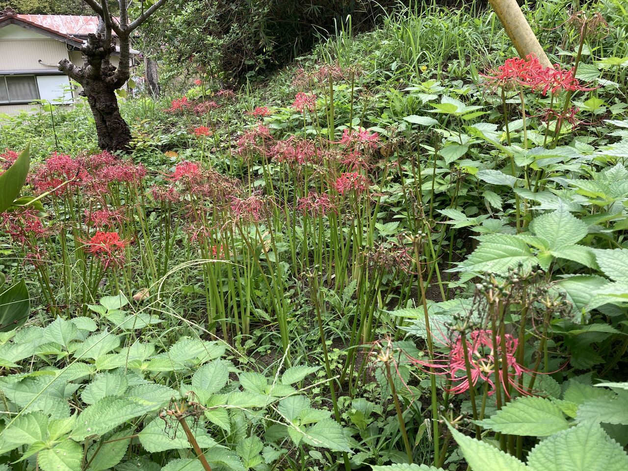 毎年、どういう訳かヒガンバナの咲き始める時期に伸びた雑草を刈っている。今年も雑草を刈ろうと思って作業をスタートしてよく見たら、ヒガンバナらしい芽が地面すれすれに顔を出し、慌ててストップした。そのせいか今年は東側の斜面にレッドベルトが広がり、去年より大きくなった。