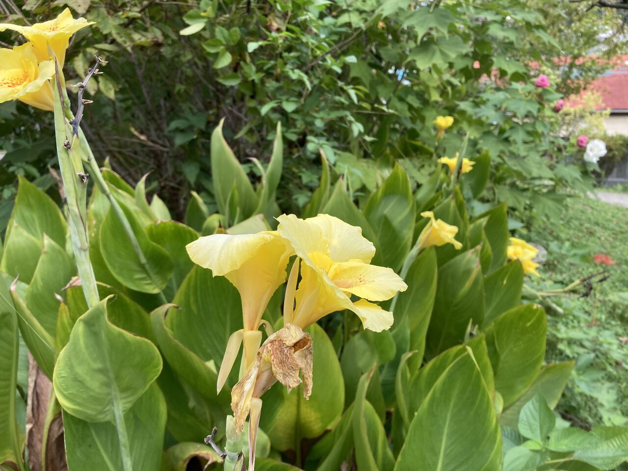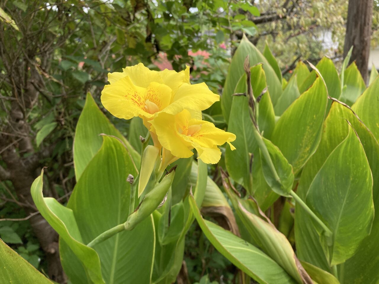 それが10月になったら、急に黄色のカンナのオンパレード。今度は赤いカンナが鳴りを潜めている。ひょっとすると色によっての開花時期が違うのかと調べてみたが、そんなことはどこにも書かれていなかった。陽当たり、水遣り、肥料のタイミングによる個体差で開花が早まったり遅くなったりするらしい。