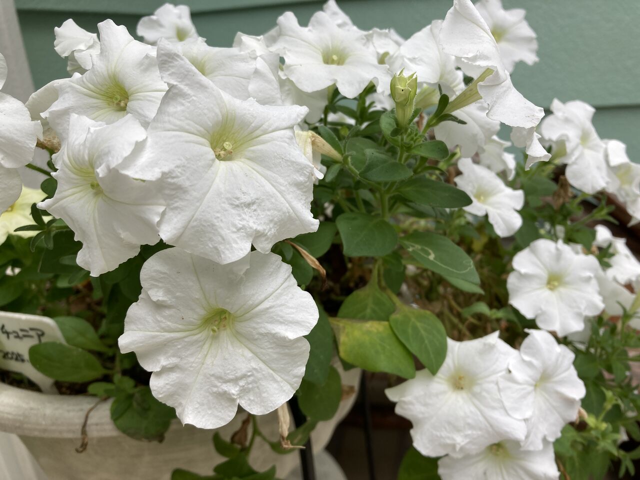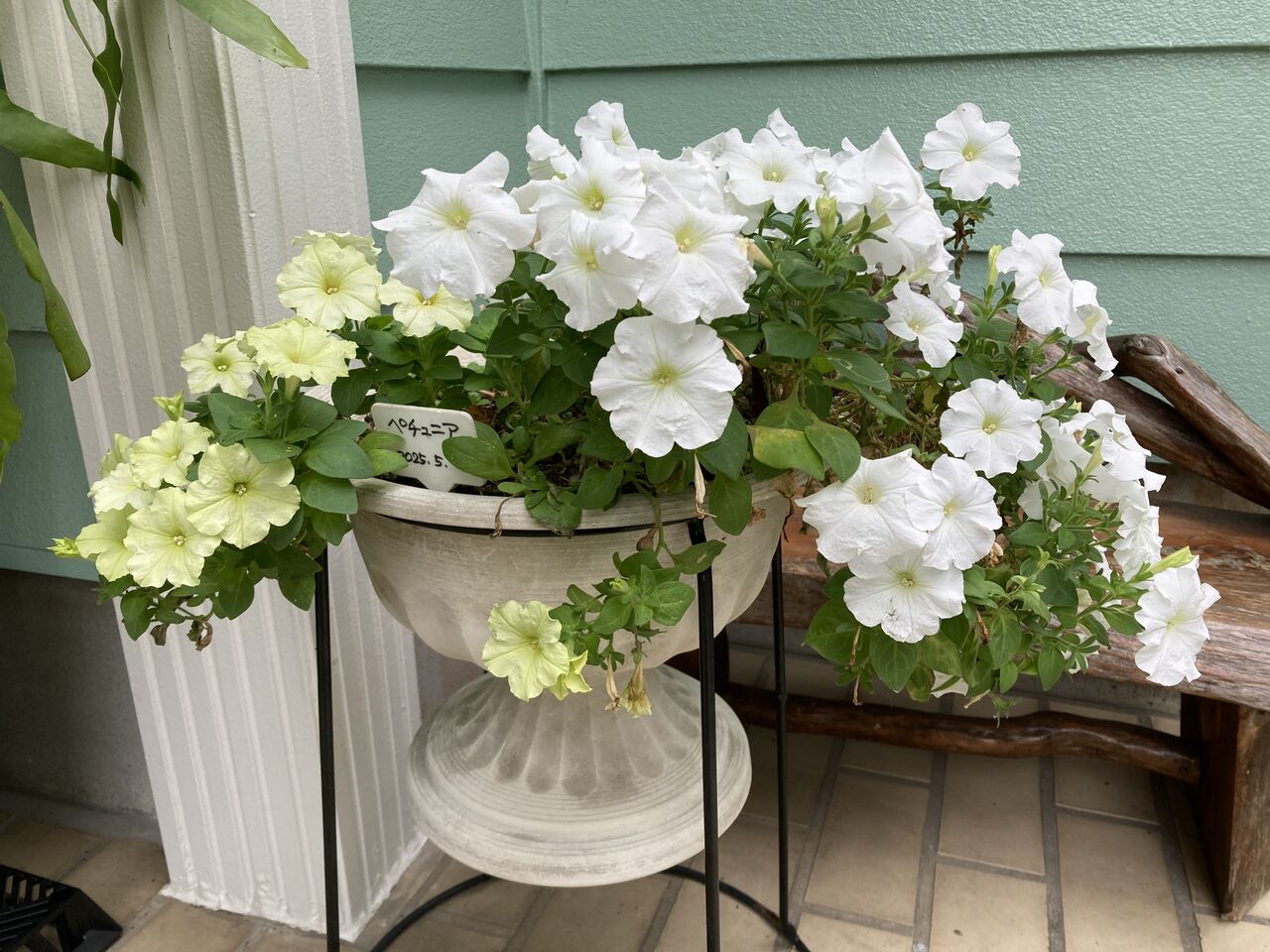 玄関の庇の下に位置するペチュニア。鉢に差し込んであるプレートに今年の5月1日とある。ホームセンターに用があって出かけた時に園芸売り場にあった小さな苗を手に入れた。