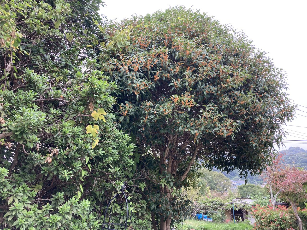 今年は花が咲きだすとちょうど台風22号と23号が太平洋を北上していったので、長い間、風に煽られて、木の下側はオレンジ色の花が無数に転がりだした。地面はコンクリートなのだが、道に接する山側から山の浸み水が垂れて来て、雨の降った後はいつも地面が濡れている。落ちたオレンジの花びらが水に濡れてちょっと寒そう。それでも木に近づくと甘い香りが漂ってきて臭いに鈍感な僕でも甘くフルーティーでフローラルな芳香を感じさせてくれる。