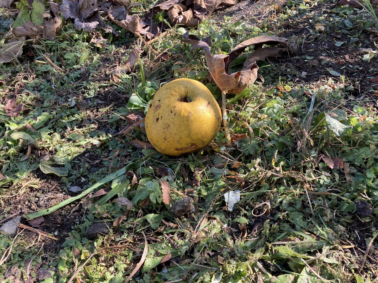 刈り込んだ雑草を熊手で集めていたら、何んとマルメロの実が枯葉の中から出て来た。「今年は9個採れた採れた!」と大喜びしていたのだが、結論は10個採れたことになった。たいして大きな木ではないのに重い実がよくぞ10個もなったものだと改めて感心してしまった。
