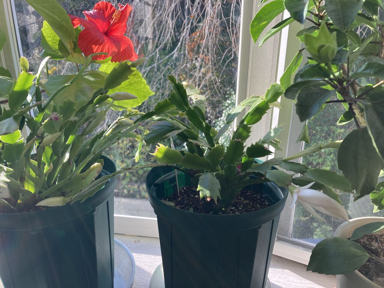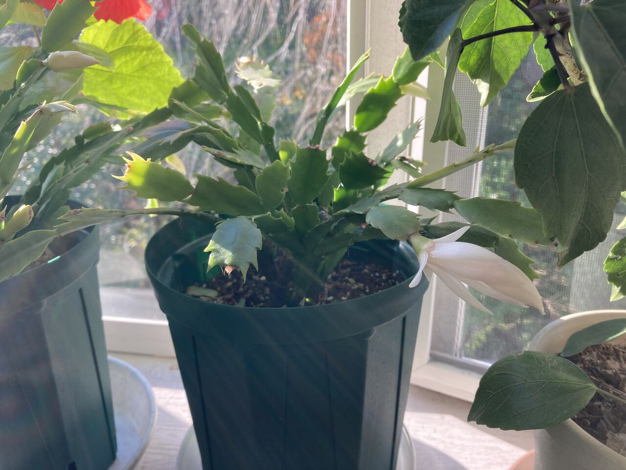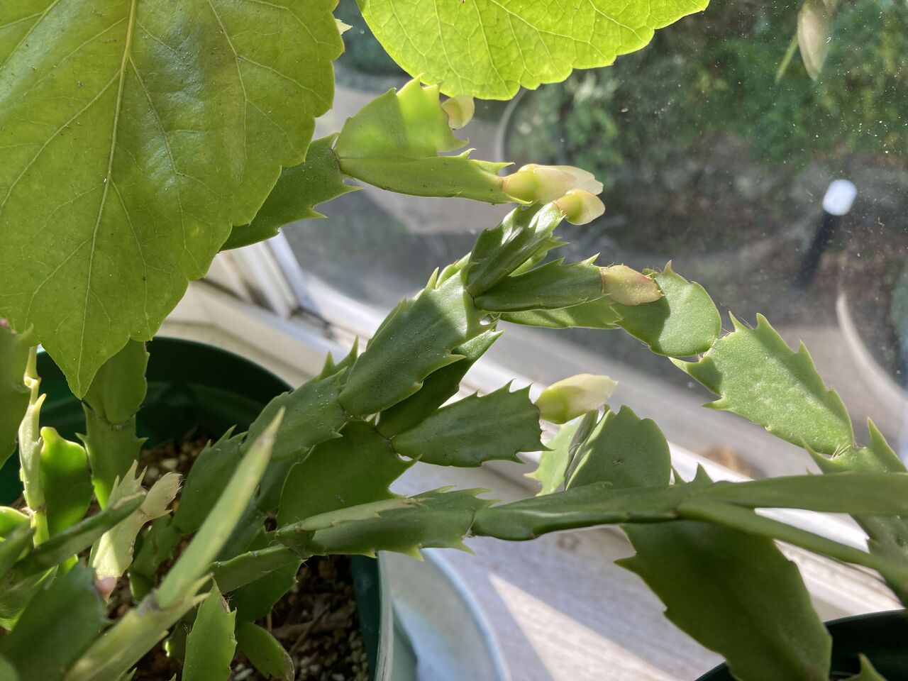 11月30日にシャコバサボテンの蕾が目立ってきたお話を書いた。未だ1週間しか経ていないのに、この寒さの中、成長の早いこと。たった一つだけでなく、葉の天辺に顔を出した沢山の白い蕾がもう少しで開花しようと頑張っている。