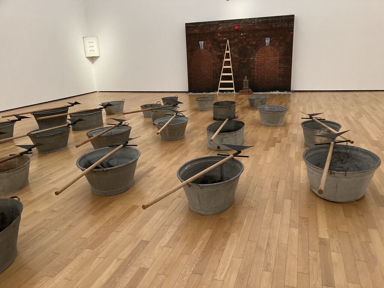 「現れ出る時」1989-2025 ブリキの盥、石炭、スコップ、カンヴァスNECOプリント、フォトアクリル、斧、梯子、電球
