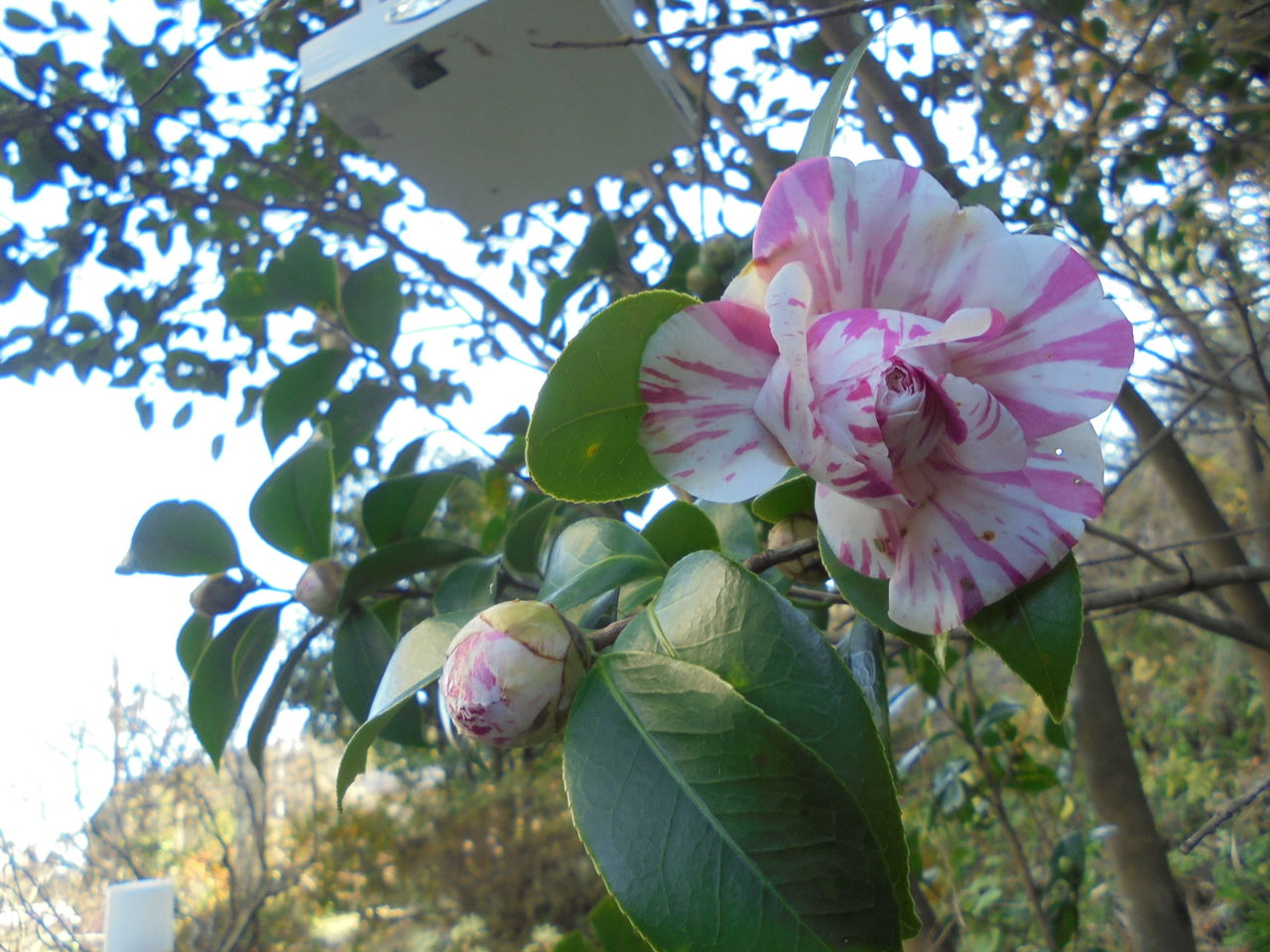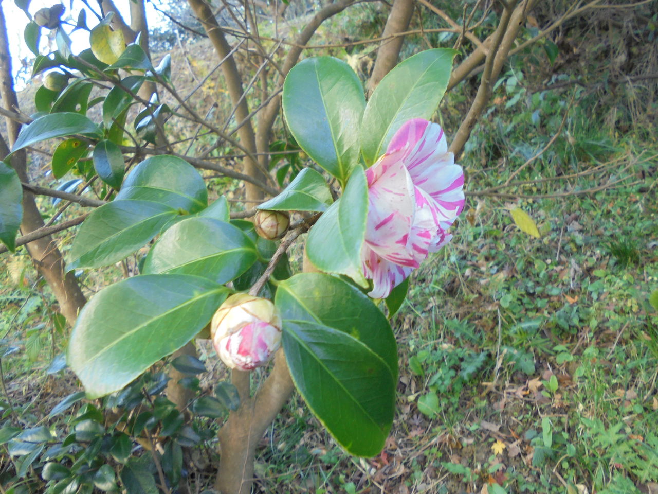そのひまわりハウスの下側に僕の大好きなキャンデーのような絞りの椿が咲いた。赤い屋根のひまわりハウスは目立つ筈なのだが、それを更にアピールするかのようにすぐ下に花を添えている。